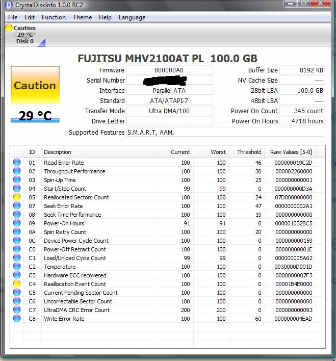 Das verwendete Programm kenne ich leider nicht und vermag die Raw-Werte nicht zu verifizieren (der Werte erscheinen doch sehr hoch und ich vermute, dass die gelbe Farbe als mittelprächtiger Zustand anzusehen ist). Ich verwende lieber die Smartmontools.