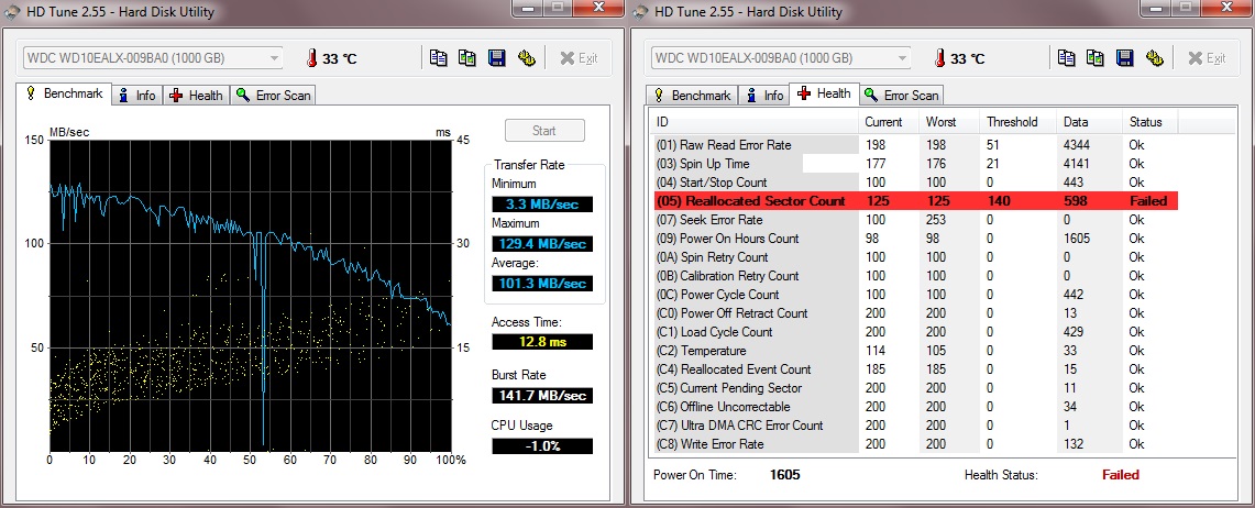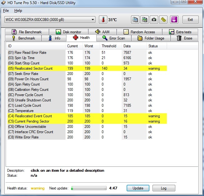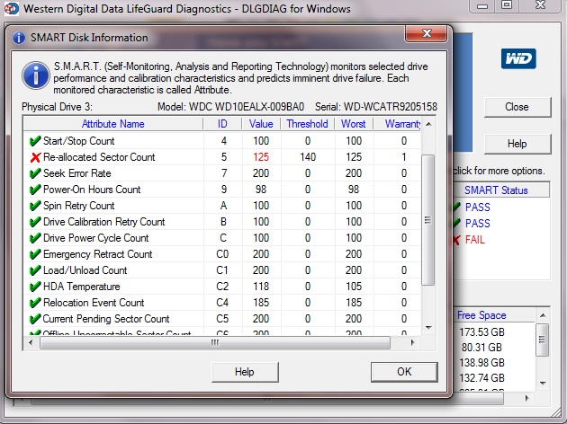 Ich habe folgendes Problem zum Knobeln bzw erhoffe ich mir ein Paar tips eure seits. Seit gestern Schickt mir Win7 ständig eine Festplatten fehlermeldung, darauf hin habe ich mir einige Analyse tools besorgt. wobei bei den meisten immer wieder der Reallocated Sector Count auffällig ist. Könnte mir bitte jemand den Kritischen zustand meiner platte erklären? Oder kann ich smart einfach unbesorgt ausschalten?