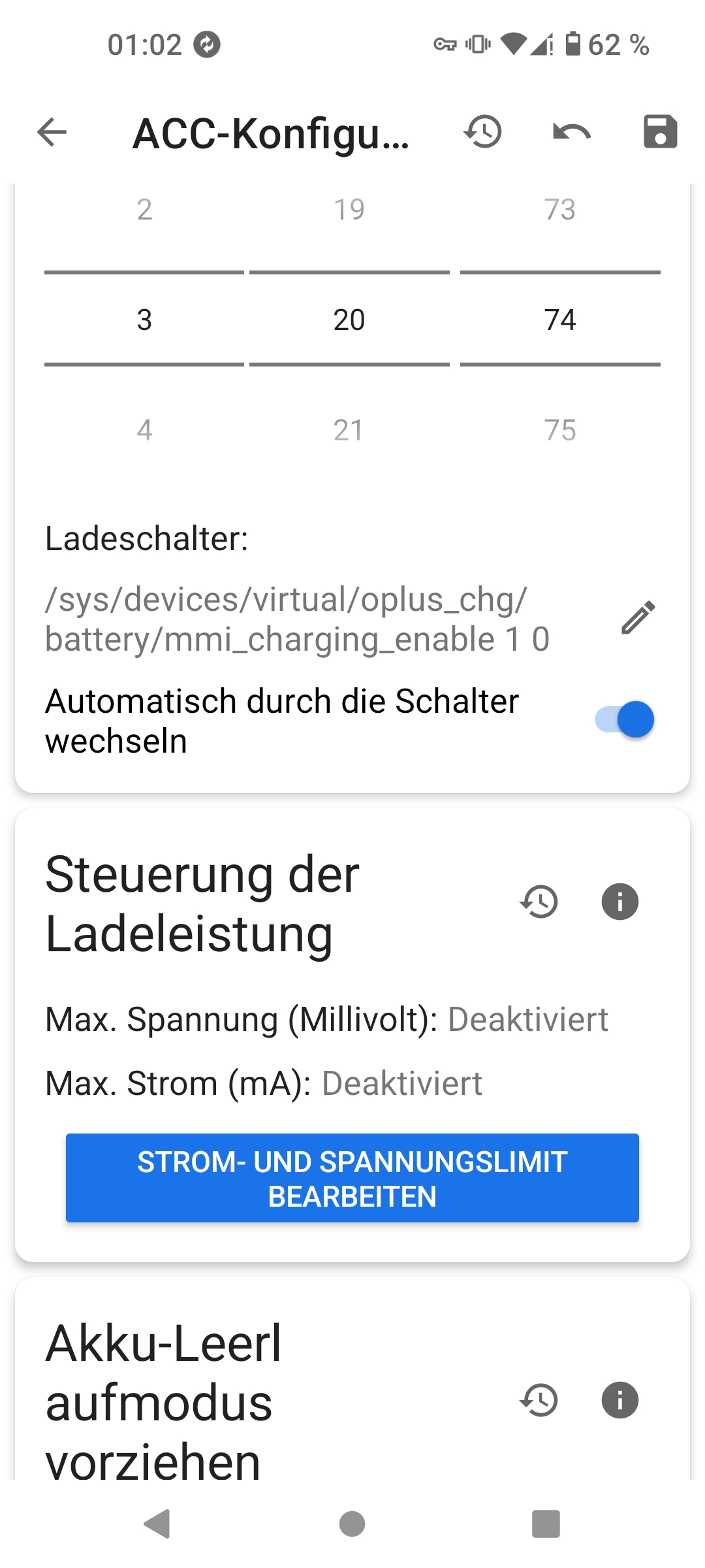 In der Root-App (auf meinem Telefon läuft kein Originalsystem) die ich zur Ladesteuerung verwende könnte ich auch Spannung und Strom anpassen.