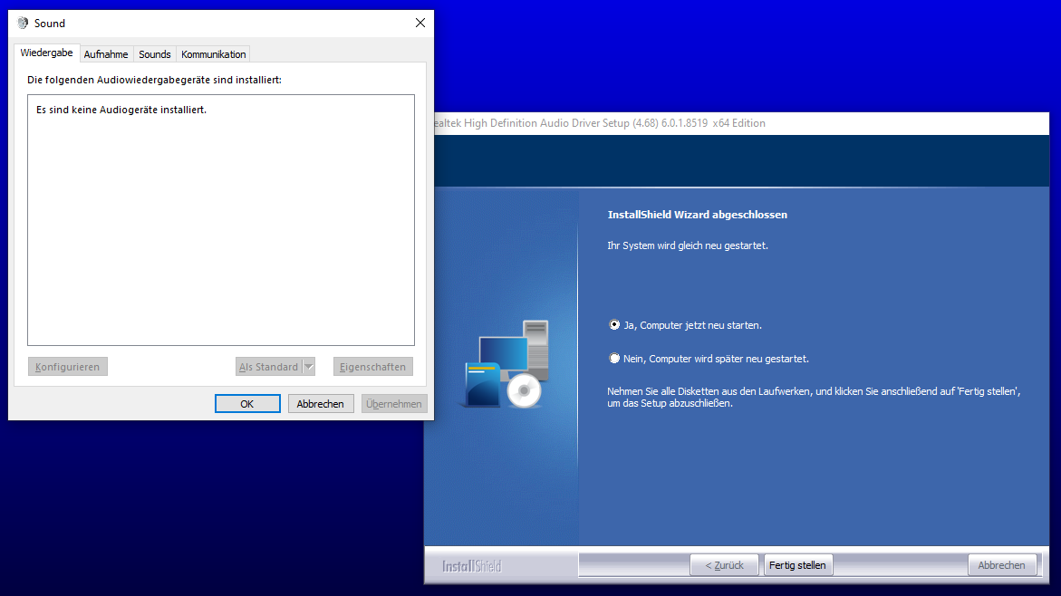 ich habe heute mein Windows 10 neu aufgesetzt, da ich des öfteren Probleme mit meinem Audio/Mikrofon hatte. Meistens konnte mein Skype-Gegenüber mich nicht hören bzw erst, wenn ich den Realtek Treiber neu installiert habe. Nach der Installation hat sich der PC neu gestartet. Dann allerdings das kuriose: Die Treiberinstallation öffnete sich erneut, installierte, erforderte einen Neustart und das ganze fing von vorne an. Noch kurioser dabei: Meine Skypegespräche konnte ich immer nur führen, solange das Setup ausgeführt wurde.