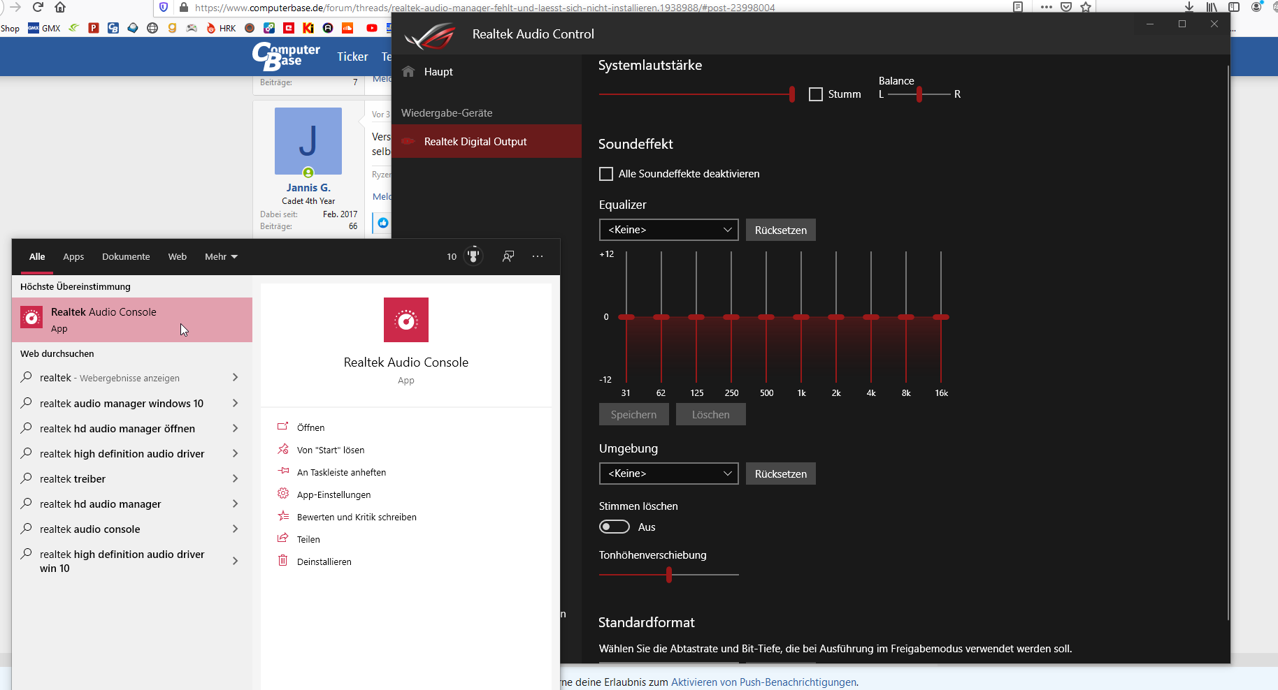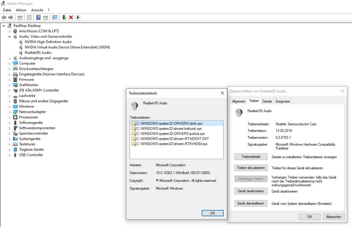 Ausserdem fehlt der Realtek Audio Manager. (Woran hoffentlich das Rauschen liegt) Die Treiber scheinen zwar installiert zu sein aber der Audio Manager, das Tool welches sich öffnen sollte beim Einstecken meines Headsets oder der Boxen fehlt. Es ist nicht in der Systemsteuerung zu finden. Im Geräte-Manager heisst es die neusten Treiber seien installiert und das Gerät laufe einwandfrei. Der PC erkennt aber nicht wenn ich etwas einstecke. Das Mikro vom Headset funktioniert daher gar nicht. Ein Wunder das über haupt Sound rauskommt.