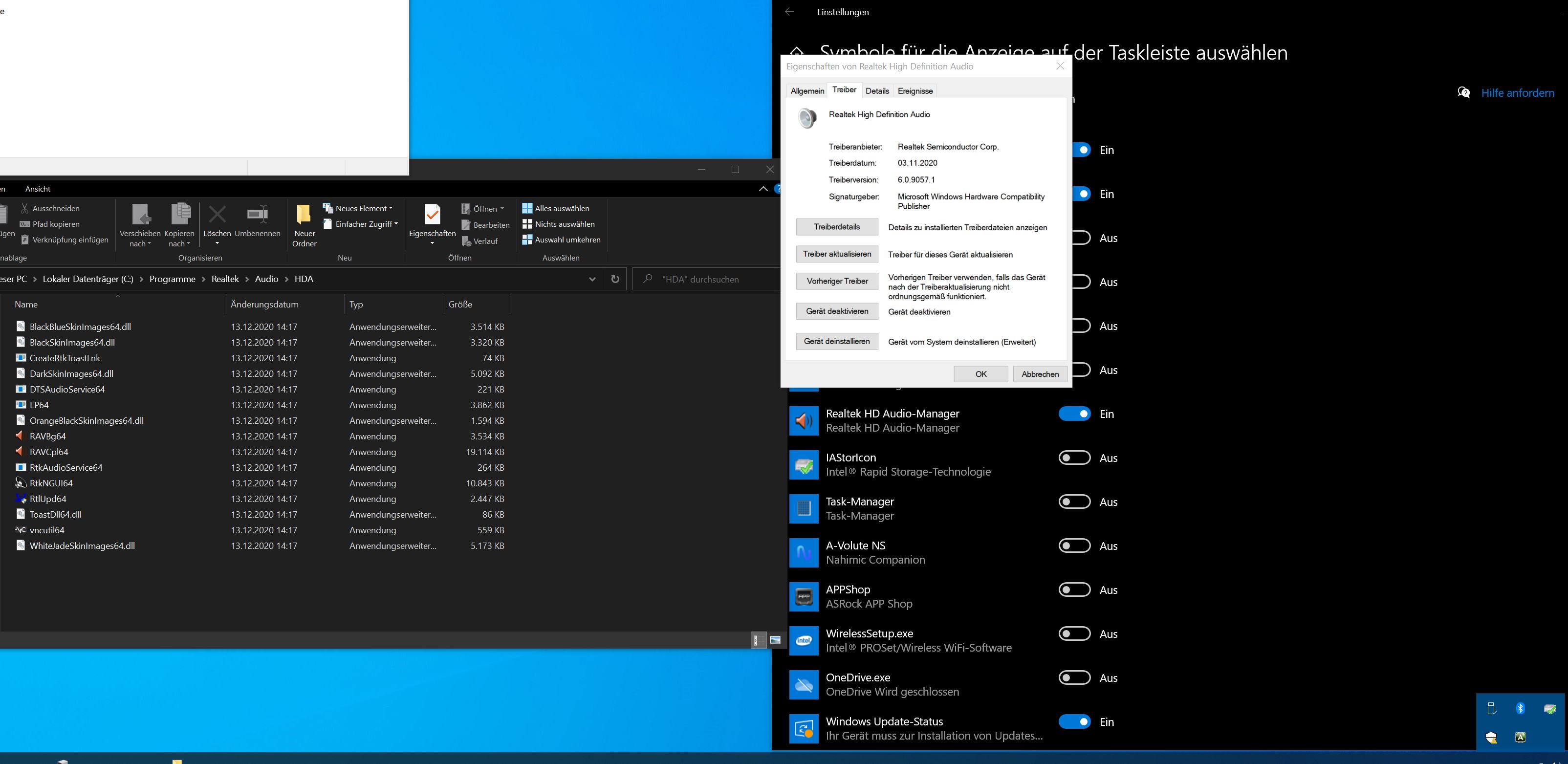 Für die Realtek Audio Control gibt es jedoch kein Symbol im Schnellstart und Nahimic3 ist kein wirklicher Ersatz für die Realtek-Einstellungen. Die Realtek-Einstellungen erscheinen nicht in der Systemsteuerung und das Symbol auch nicht in der Taskleiste angezeigt, obwohl in der "Symbolen für die Anzeige auf der Taskleiste" ein Symbol RAVCpl64.exe aufgelistet wird, das jedoch nicht erscheint, egal ob Treiber installiert oder nicht.