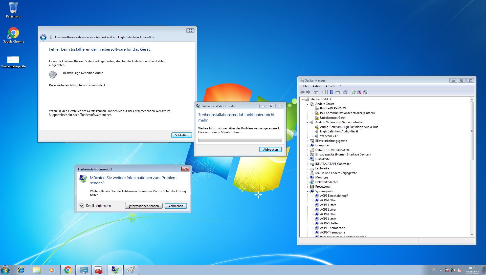 Bei jedem Abbruch kommt die Fehlermeldung "Treiberinstallationsmodul funktioniert nicht mehr!", ein Fehlercode kommt nicht, auch hier bin ich im Netz nicht weitergekommen.