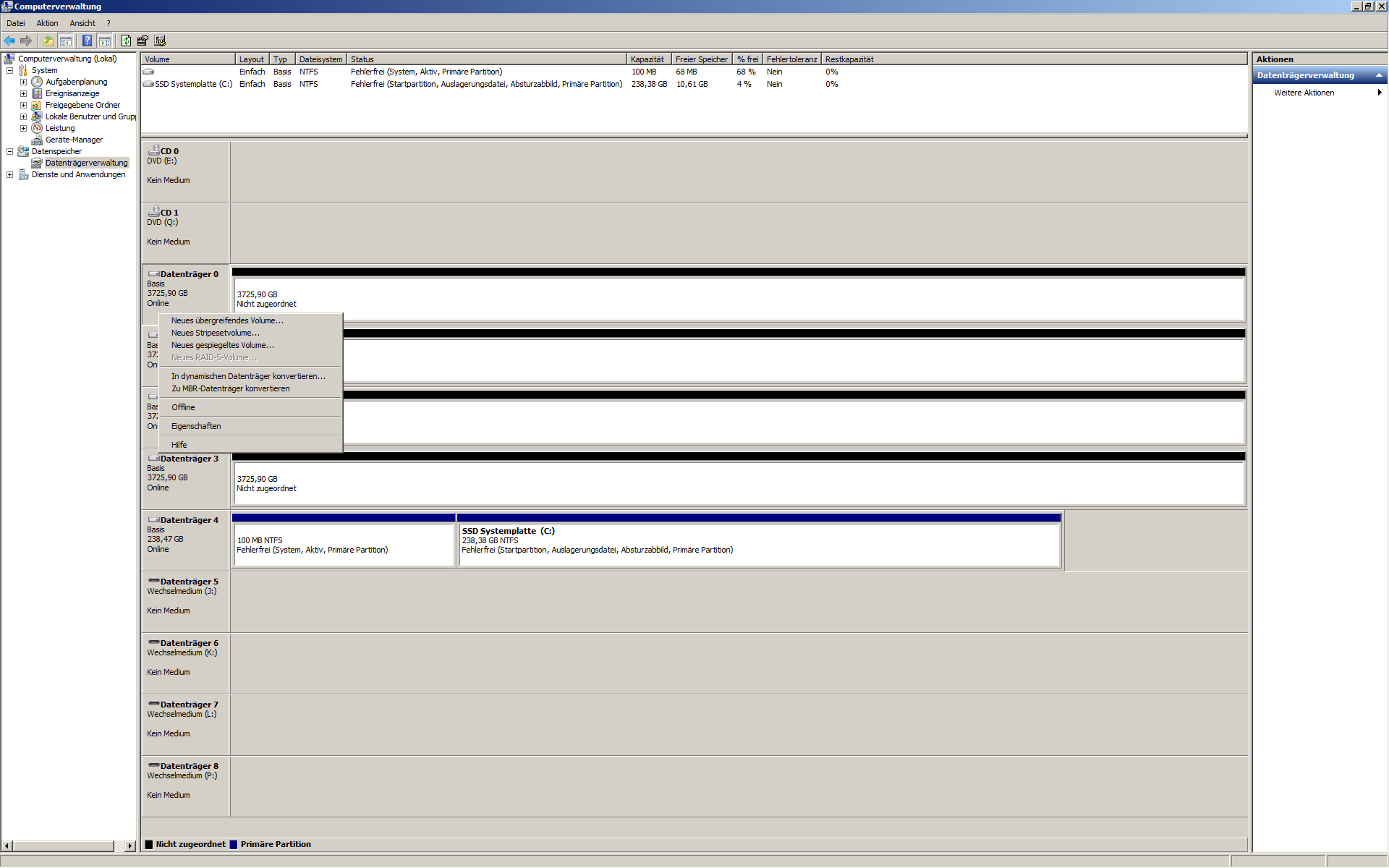Board: Gigabyte GA-890FXA-UD5, eine SSD mit Windows 7 und dann die 4 Disks mit jeweils 4TB Kapazität für das RAID10.