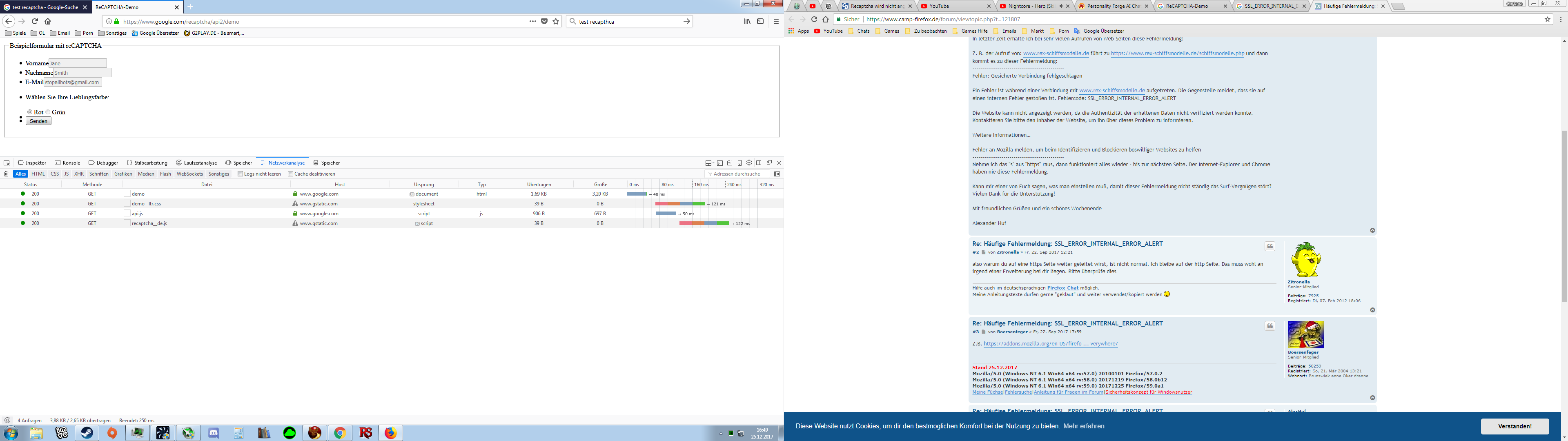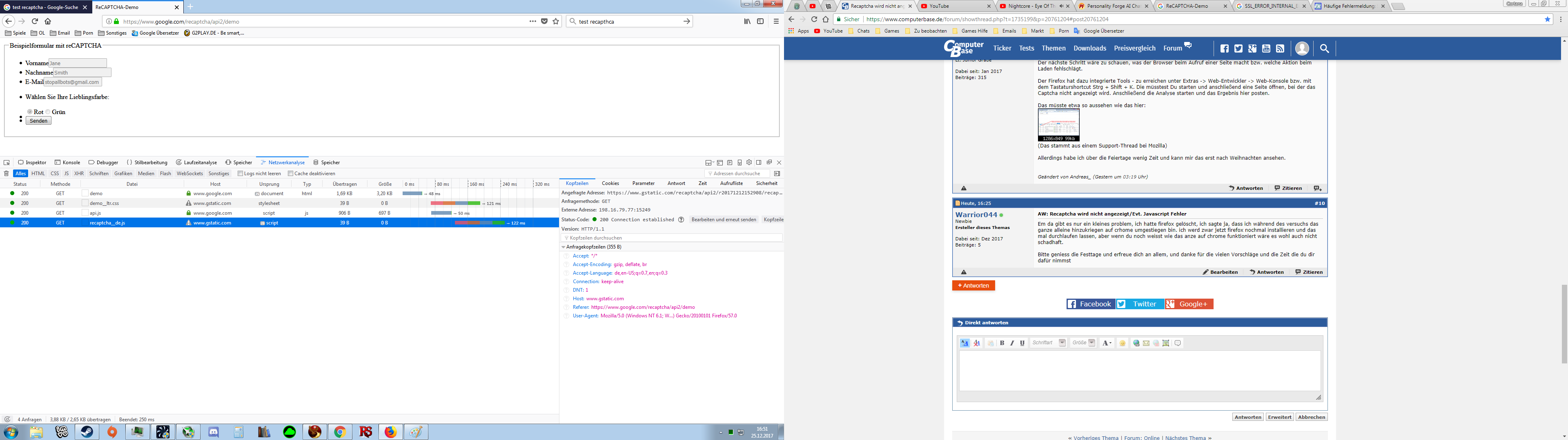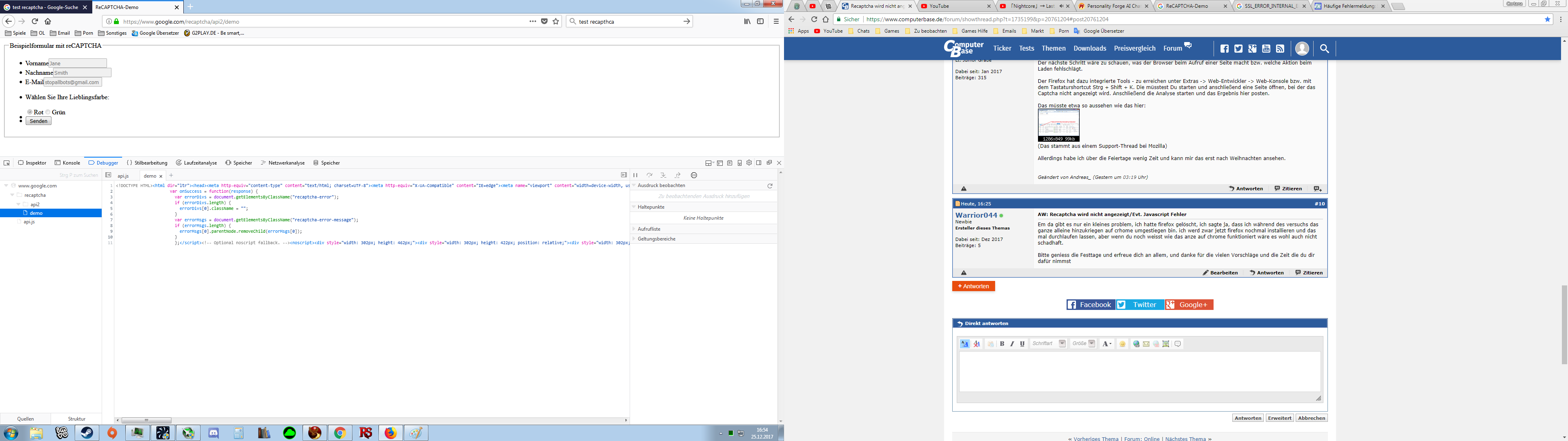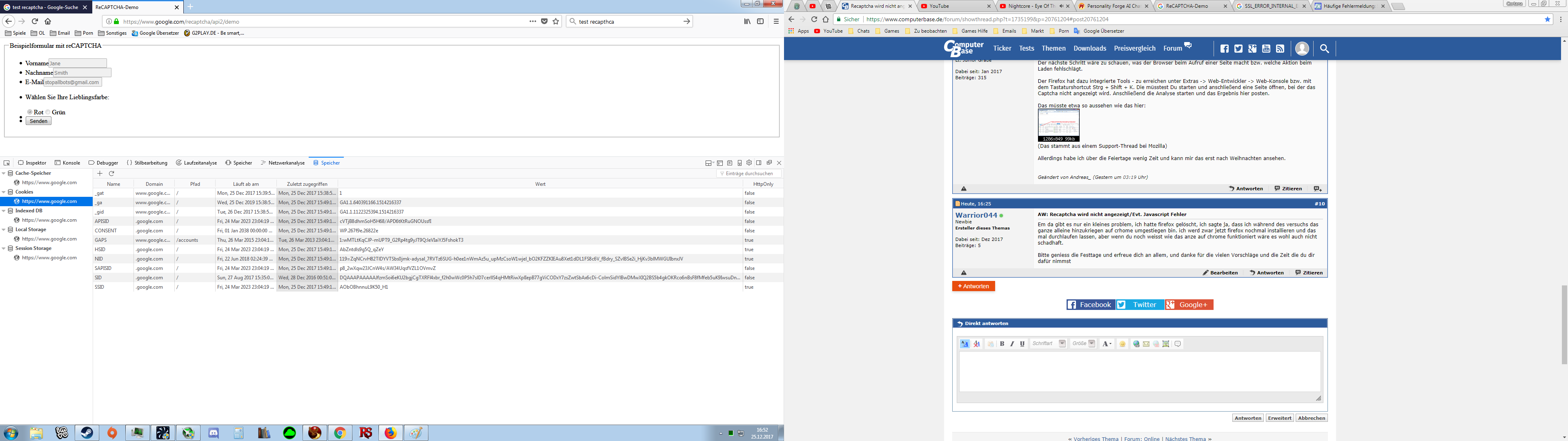 Seit einiger Zeit schon (rückblickend geschätzt 1-2 Monaten), werden bei mir keine Recaptchas ( aka " ich bin kein Roboter") angezeigt. während mir das am anfang noch kaum auffiel, bzw mit einem schulterzucken abgetan wurde, nervt es mich mittlerweile massiv, dass ich immer wieder nicht auf eine Seite zugreifen, bzw mich anmelden kann. Bei anderen websites wie "flexible survival" wird mir bei versuchter anmeldung mit bestehendem Account eine leere seite mit dem text "need to enable Javascript" in der ecke angezeigt.