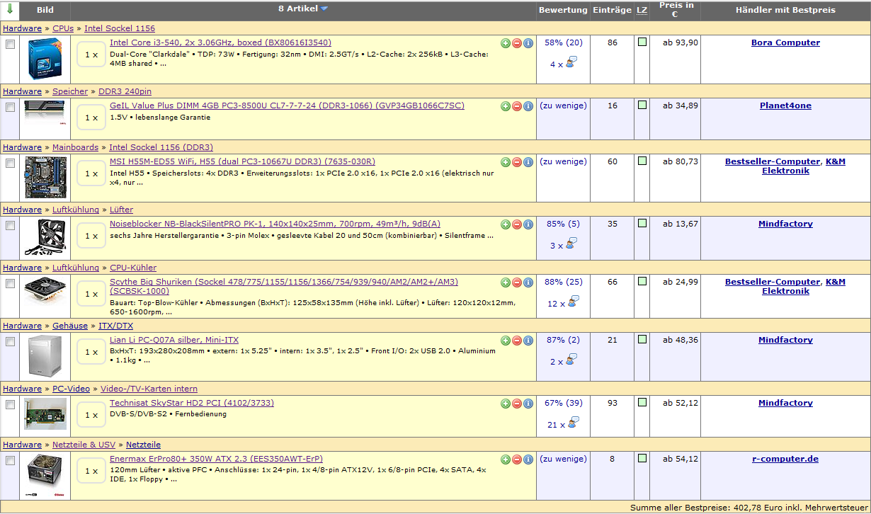 Atom Mainboard, 2 oder 4 GB ram, WLAN N , DVB-S2 Karte. Unter 300€