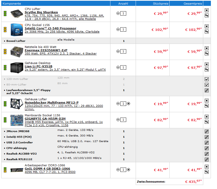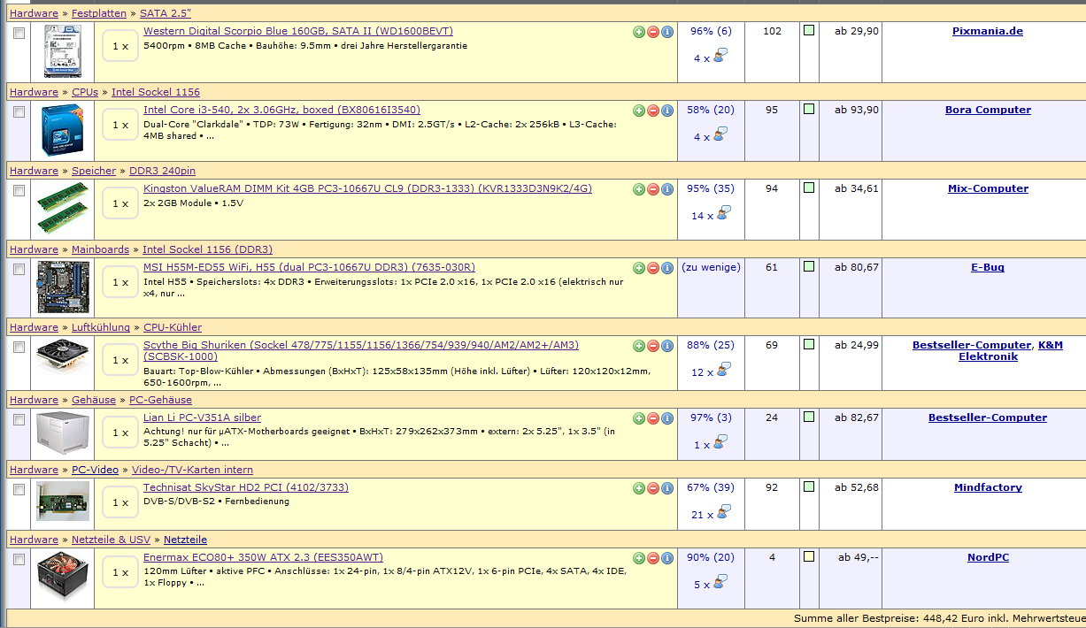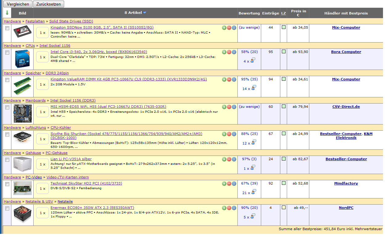 P.S.: Um den/die günstigsten Händler herauszufinden, packst du am besten alle Komponenten bei geizhals in eine Wunschliste und lässt dir dann den günstigsten Preis berechnen...