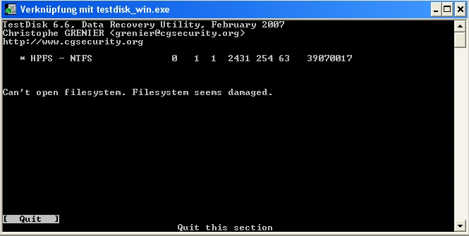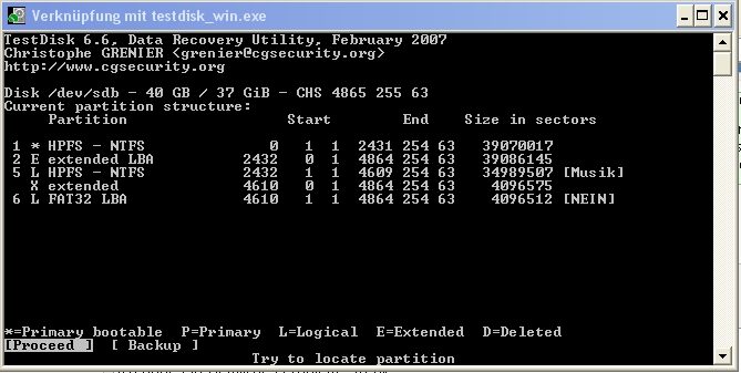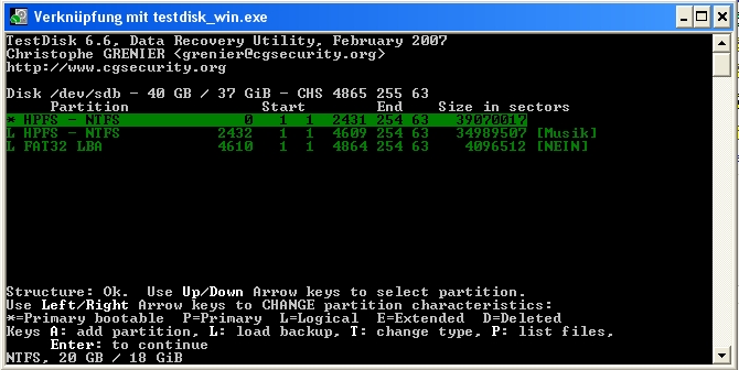 Habe mir nun Testdisk 6.6 runtergeladen. Nur leider komme ich damit nicht so ganz zu recht. Vielleicht kann mir hier ja jemand weiterhelfen!?