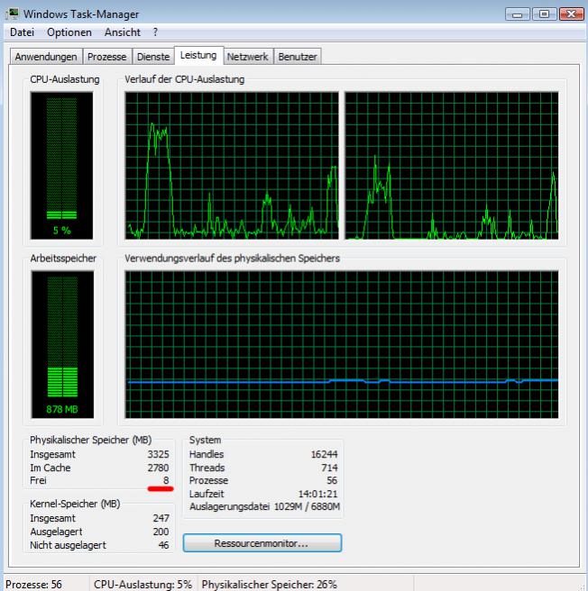 Ich hab das Problem soweit auf den RAM zurückgeführt, zumindest glaube ich, dass es der RAM ist, weil direkt nach dem hochfahren noch alles in Ordnung ist und 5min später geht's dann los - parallel dazu steht dann im Task Manager, dass noch 10 MB frei sind (siehe Screenshot). CPU-Auslastung konstant niedrig, weil natürlich nichts läuft. Unter "Prozesse" erscheint alles normal, also Firefox mit 100 MB RAM-Besetzung, der Rest auch alles üblich mit 20-100 MB Verbrauch.
