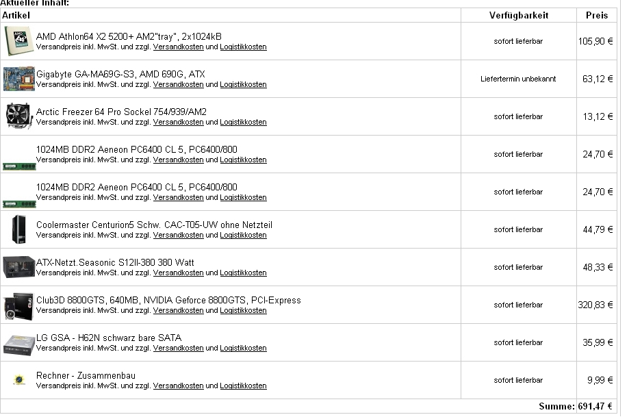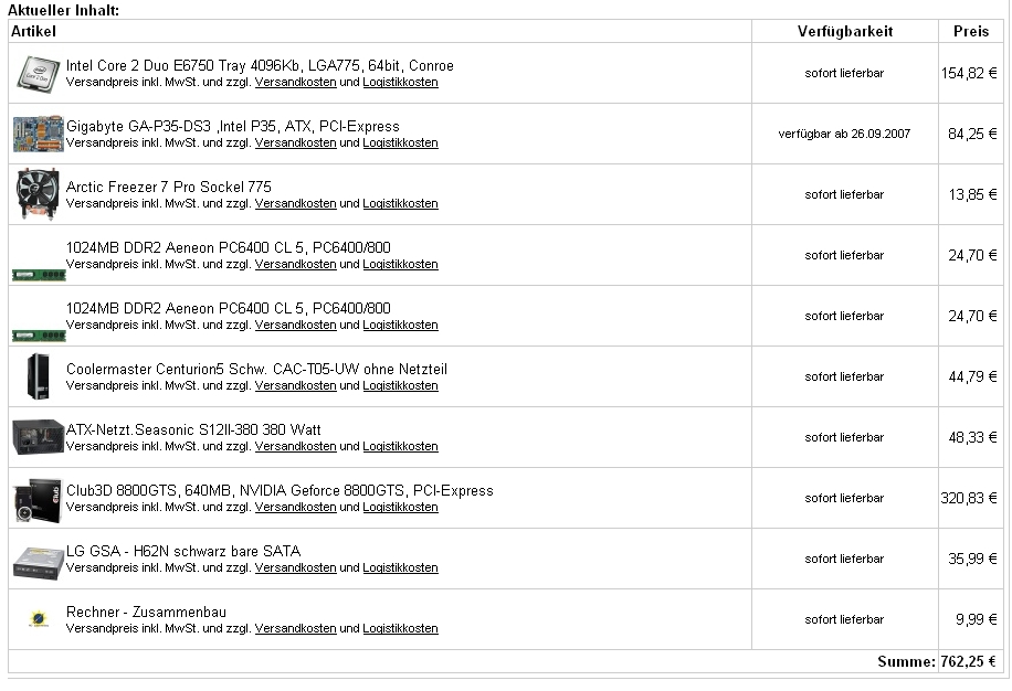 ein Intel® Core 2 Duo E6850 L1:2x32KB L2:2x2048 KB mit 2x3.0 GHz kostet rund 233€ (65Watt)