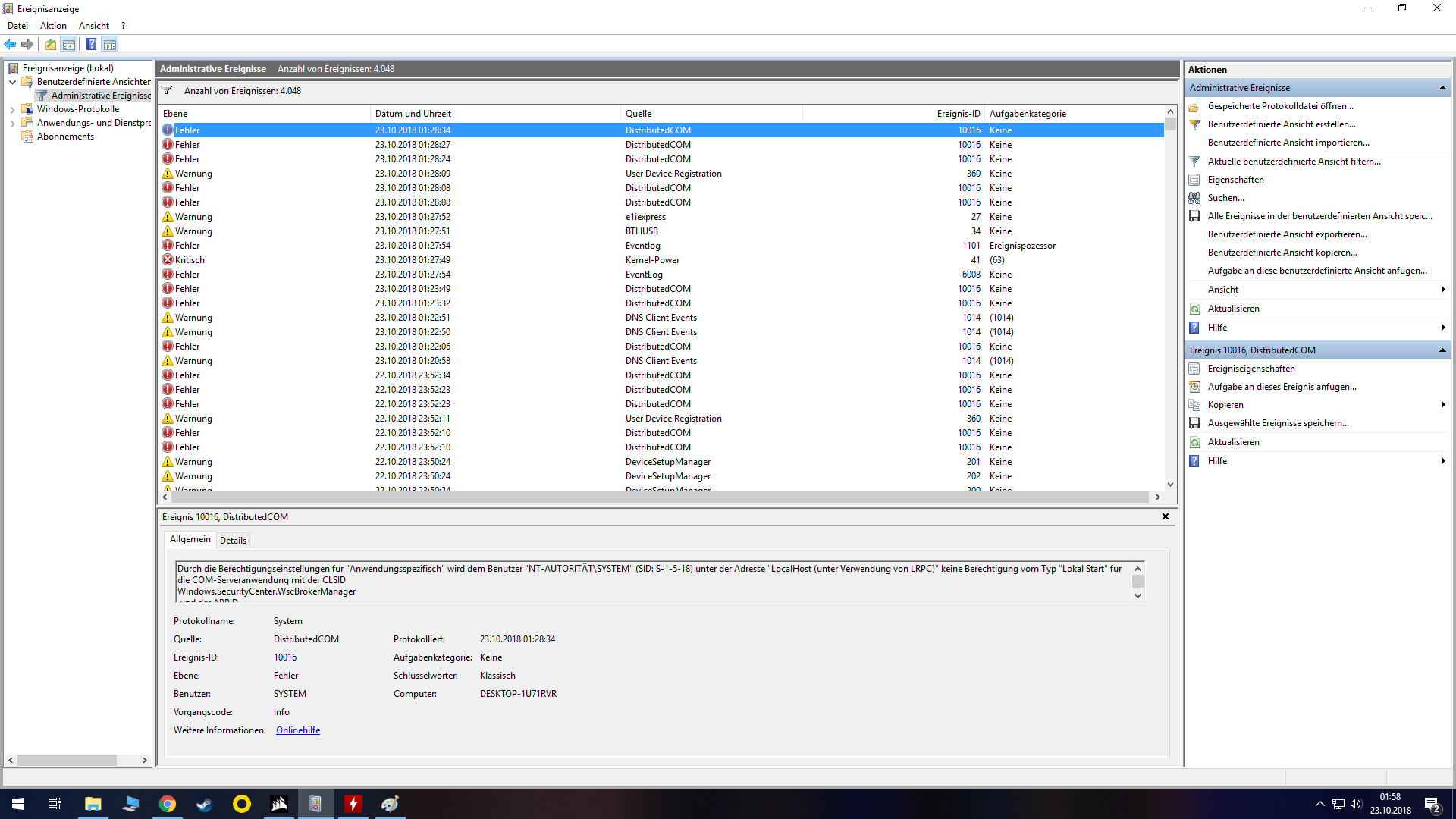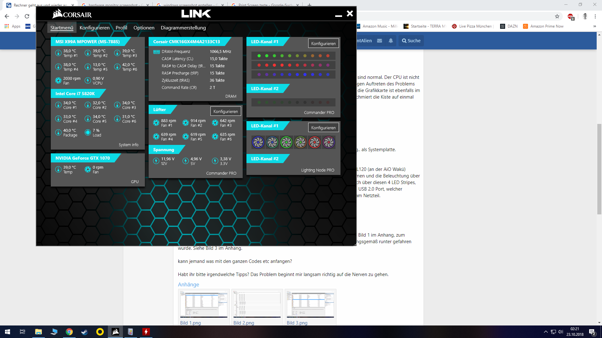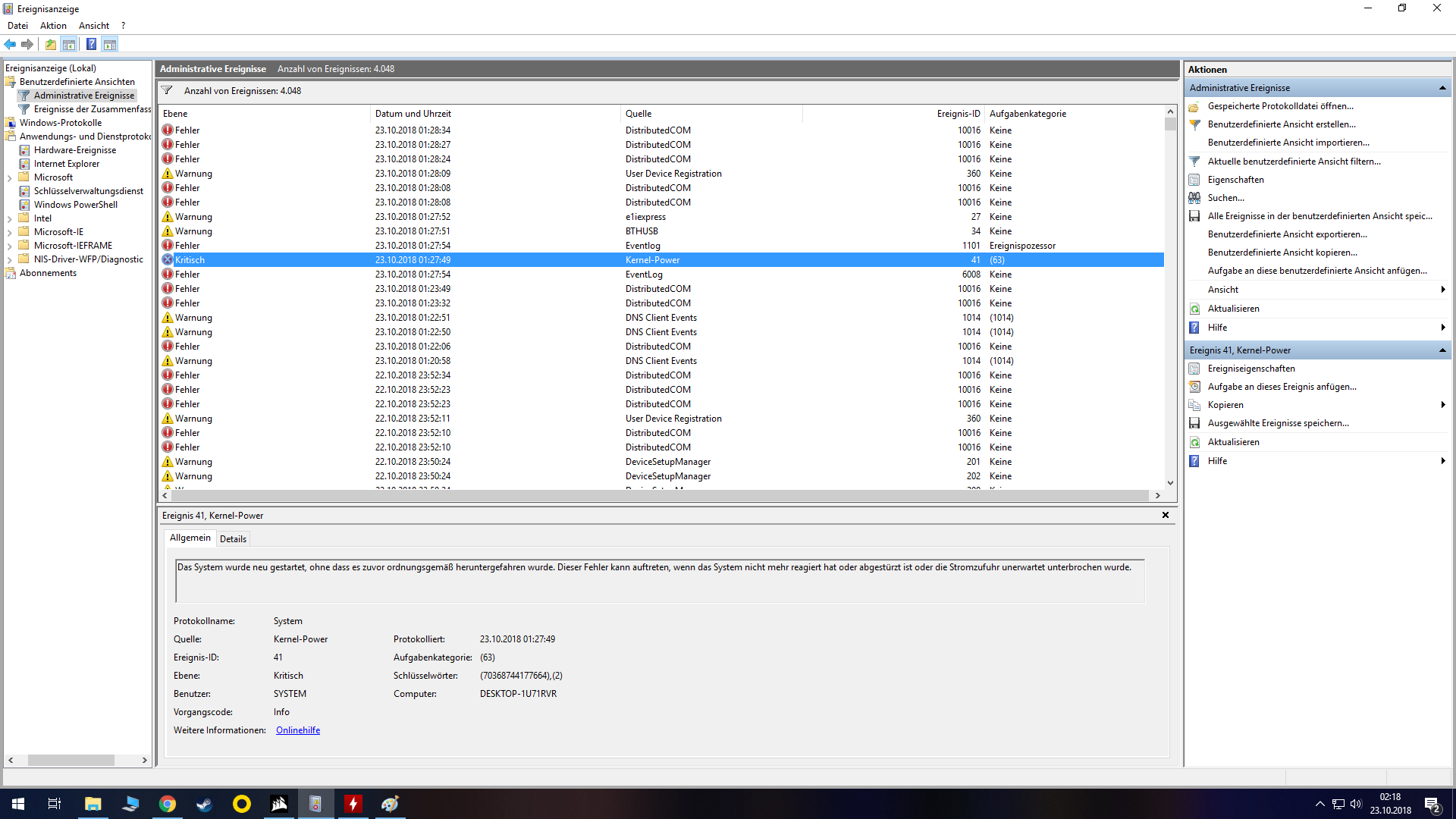 Die Ergeinisanzeige spuckt mir ständig irgendwelche Fehler und Warnungen aus, siehe Bild 1 im Anhang, zum Fehlerereignis zeigt mir das Protokoll nur, KRITISCH und dass das System nicht ordnungsgemäß runter gefahren wurde. Siehe Bild 3 im Anhang. In Bild 4 noch die Übersicht von Corsair LINK