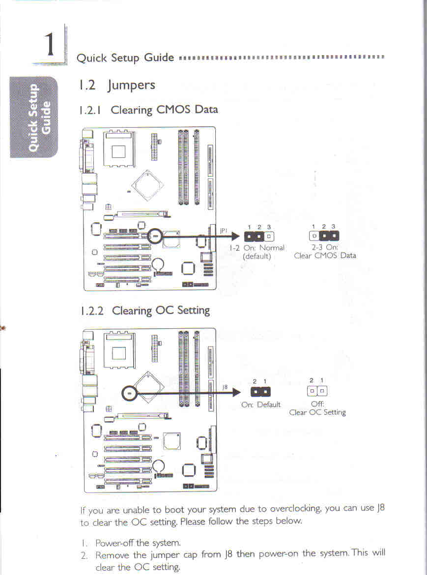 Den Clearing OC Setting Jumper brauchst Du dazu normalerweise nicht zu verstellen (per default ist der Jumper drauf), da der Clearing CMOS Data Jumper ja eh ALLE Einstellungen zurücksetzt...
