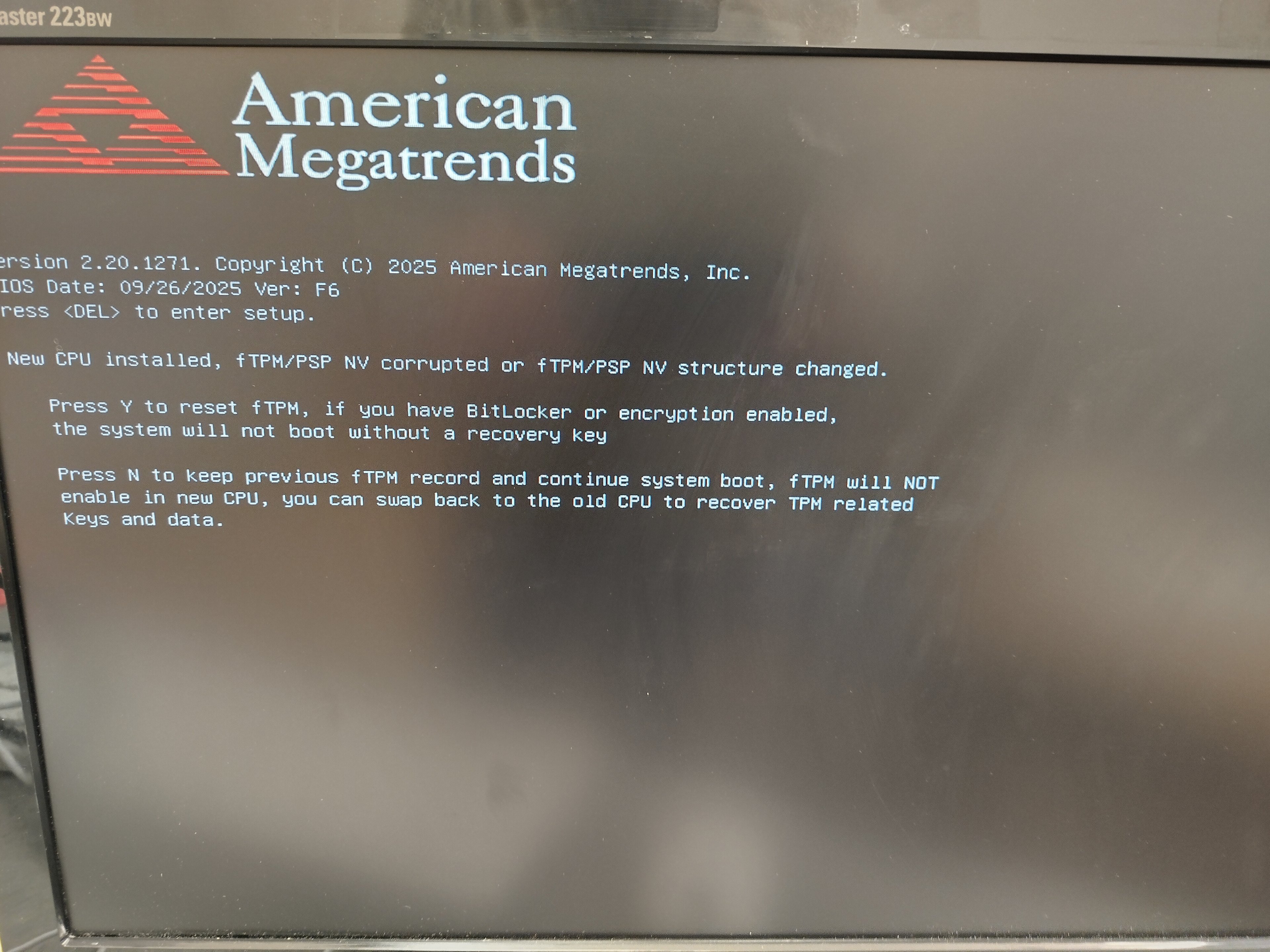 Ich müsste jetzt die Taste Y drücken um dieses FirmwareTrustedPlatformModul zurückzuseten,"sihe Foto"