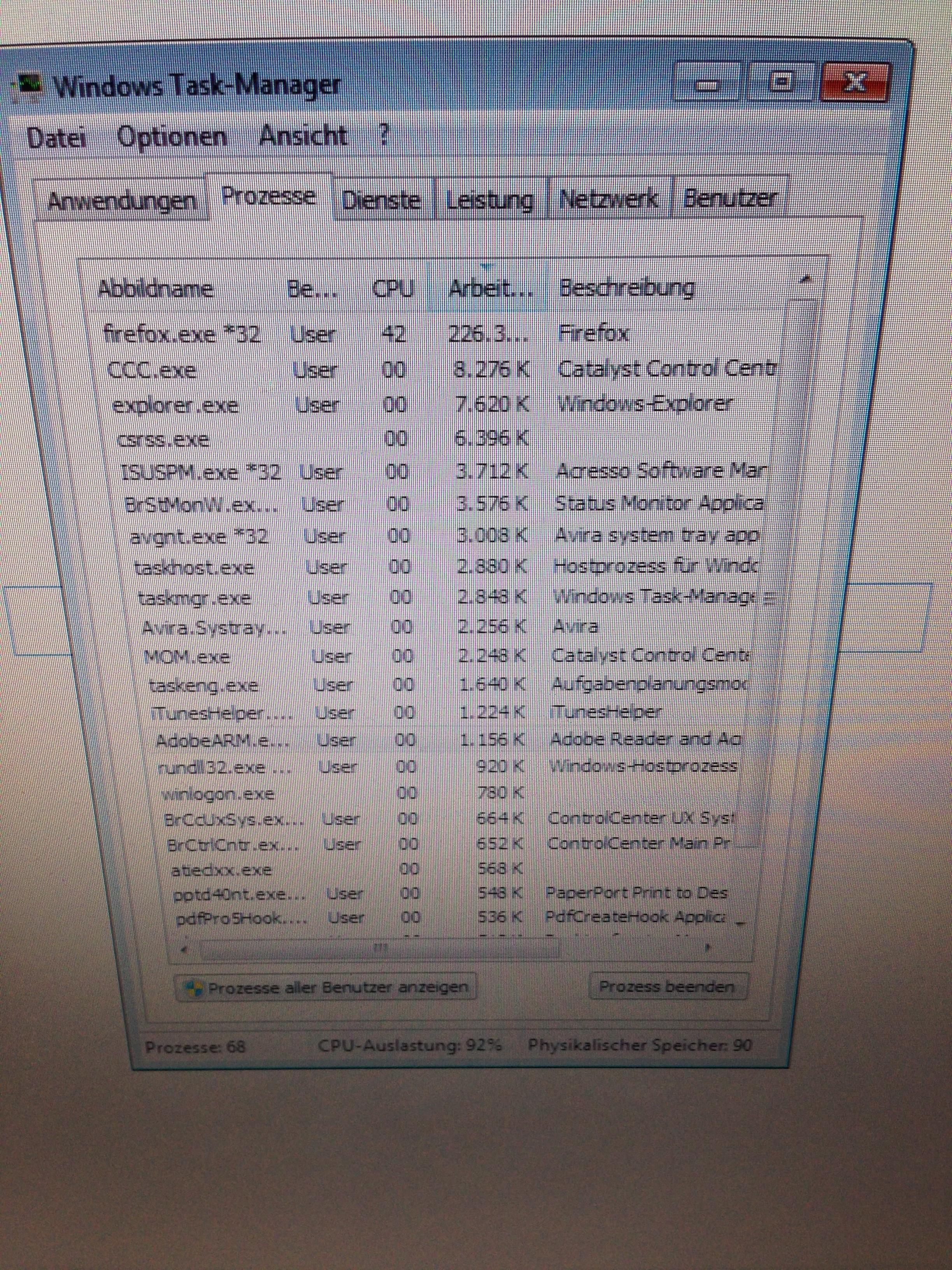 Also zunächst mal vielen Herzlichen Dank für die vielen Antworten. Ich werde nachfolgend vereinzelt auf Antworten eingehen. Außerdem hänge ich euch mal fünf Fotos vom Task-Manager an. Die ersten drei Fotos zeigen den Task-Manager ein paar Minuten nach dem Hochfahren, während keine Anwendung geöffnet ist. Bei den anderen beiden habe ich Firefox geöffnet. Der Prozessor muss tatkräftig mitarbeiten. Der Arbeitsspeicher ist schon nach dem bloßen Start von der Leistung her voll am Anschlag.