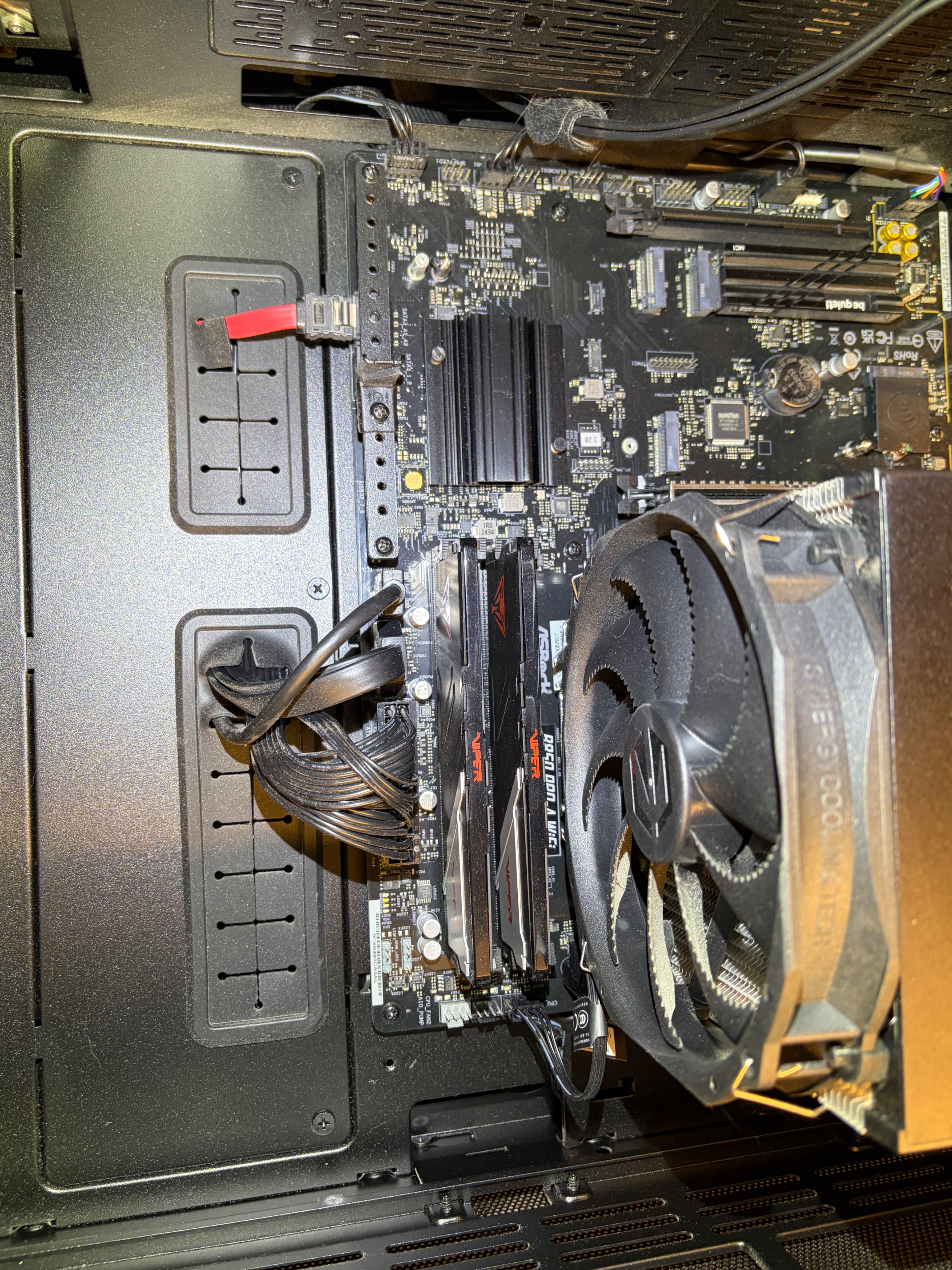 Nach dem erneuten einschalten bleibt der Bildschirm aus (kein bios), alle Lüfter laufen auf 100% und die CPU und RAM LED bleiben dauerhaft an.