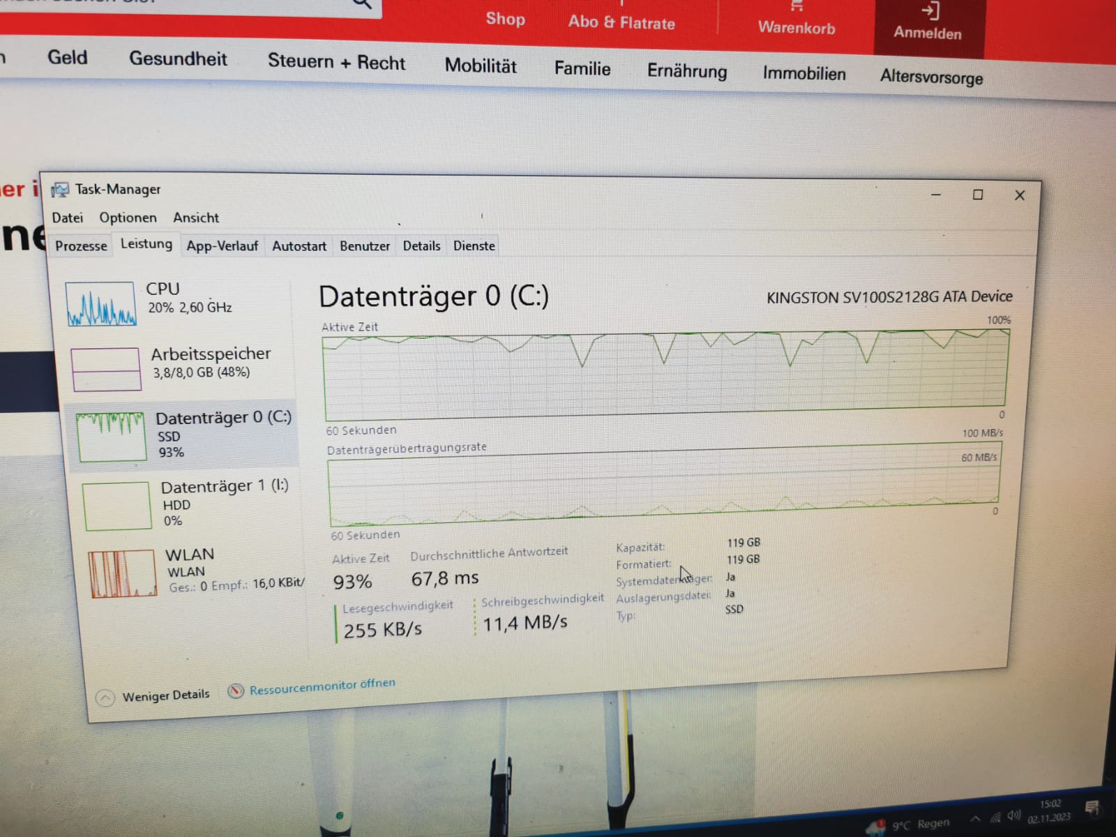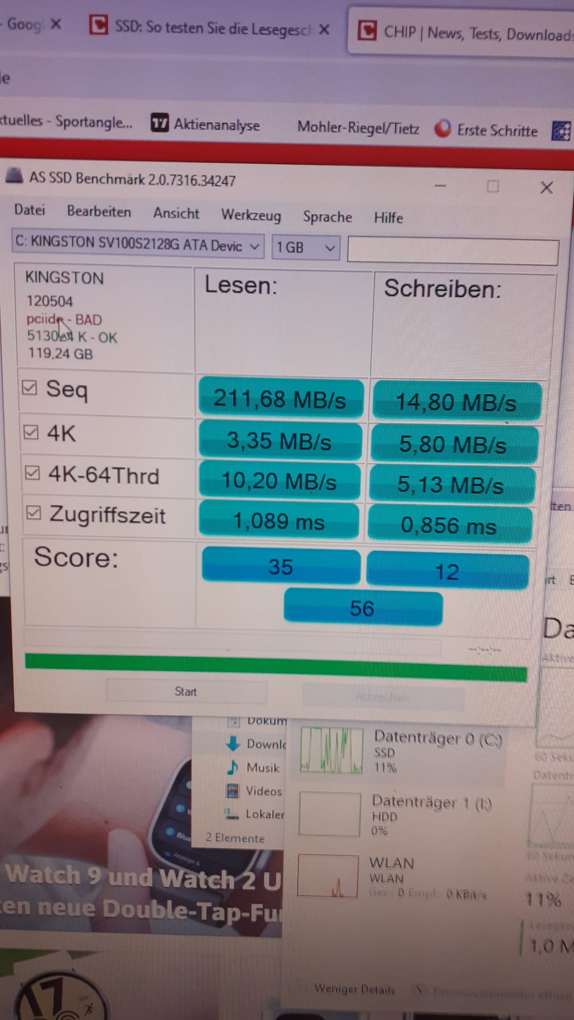 Da der Taskmanager eine hohe Auslastung der SSD zeigte ("Screenshot" 1), habe ich die Eltern mal einen Benchmark für die eingebaute SSD (Windows) (Bild 2) und HDD (Daten) (Bild 3) laufen lassen.