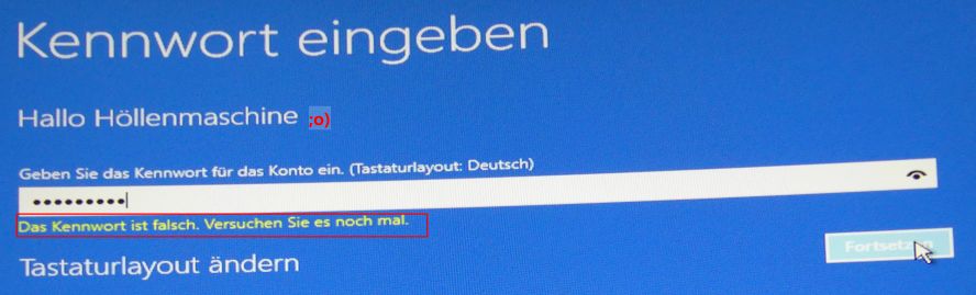 Bei Windows 10 gibt es ja auch eine Passwort-Vergessen Funktion", richtig, gibt es. Die >Passwort-Vergessen Funktion< habe ich schon aufgerufen und getestet. Die Microsoft-Vergessen Antwort umfasst ein paar Zeilen, die die kein Passwort anzeigt, im Kern darauf hinweist, dass ich Admin bestätigen soll. Bestätigt, beginnt das ->"automatische Reparatur wird vorbereitet"->"Kennwort eingeben"->"das Kennwort ist falsch, versuchen Sie es noch einmal".- Spiel erneut. Zu diesen Antworten ein halbes Dutzend Anlagen die viele Fragen beantworten und auch in das BIOS.