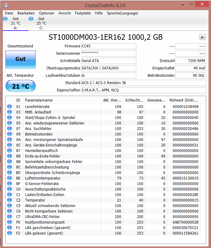 Sternenbastard schrieb:müßte bei jedem Laufwerk "Gut" erscheinen, wenn das Programm "Vorsicht" ausgibt, dann solltest du die SATA-Kabeln austauschen gegen neue und dann nochmal testen.