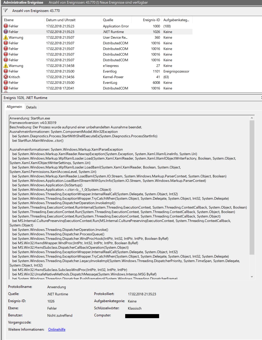 Achja, einen Auszug aus der Ereignisanzeige habe ich auch noch: