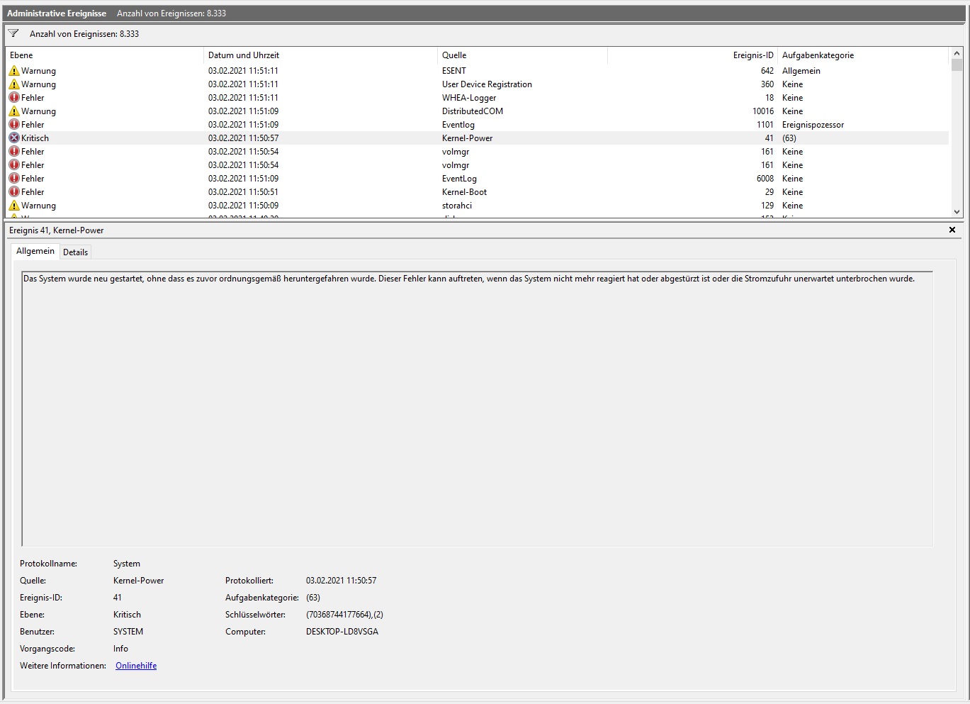 mein Problem ist wie ihr schon oben sehen könnt, dass mein Rechner sich nicht mehr ordnungsgemäß runter fahren lässt. Jedes Mal wenn ich das Versuche, fährt er nach einer Weile wieder hoch. Wenn ich dann in der Ereignisanzeige unter Administrative Ereignisse schaue bekommen ich eine Kritische Kernel Power ID 41.