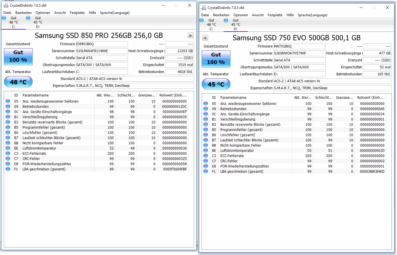 ich habe ein merkwürdiges Problem. Ich habe neulich eine zweite SSD (750 Evo) eingebaut und mir ist aufgefallen, dass diese nur mit SATA 2 angebunden ist. Nachdem ich das Sata Kabel gewechselt habe wurde sie nun mit Sata 3 angebunden. Gut ist dachte ich mir. Jetzt ist mir aber aufgefallen, dass BEIDE SSD's, sowohl 850 Pro Systemplatte und 750 Evo immer wieder selbstständig von SATA 3 auf 2 und umgekehrt wechseln ohne dass ich was am System ändere, sprich den Rechner aufschraube und physisch die Stecker ändere. Während ich zum Beispiel diesen Text schreibe ist die Systemplatte mit Sata 2 und die 750 Evo mit Sata 3 angebunden. Vor zwei Stunden waren beide noch mit Sata 3 angebunden, der PC wurde weder heruntergefahren noch in Standby versetzt. Heute morgen waren beide mit Sata 2 angebunden. Wie gesagt, der Rechner steht unterm Schreibtisch und wird nicht bewegt.