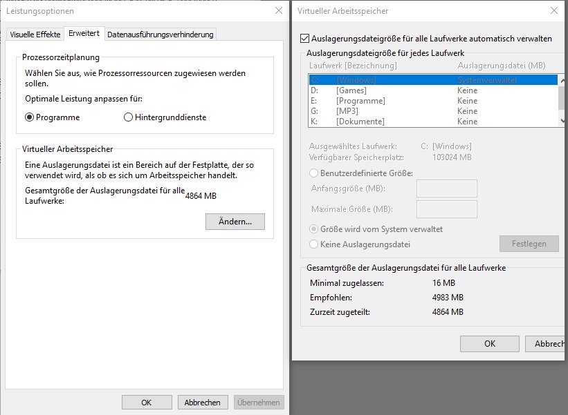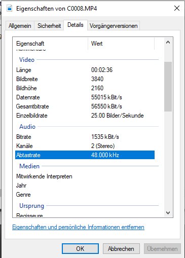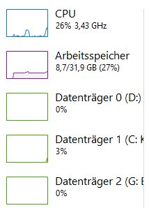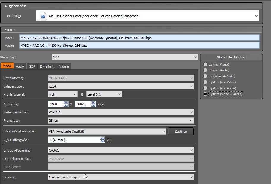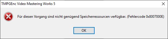 Beim Enkodieren in 4K kam dann auch nach ca. 30 % ein Fehler, dass nicht genügend Speicherressourcen verfügbar wären. Wobei ich im Taskmanager nirgends eine Limitierung sehen kann (bspw. RAM 8 von 32 GB belegt, CPU bei 26 %, Festplatte über 100 GB frei). In FHD klappte es.