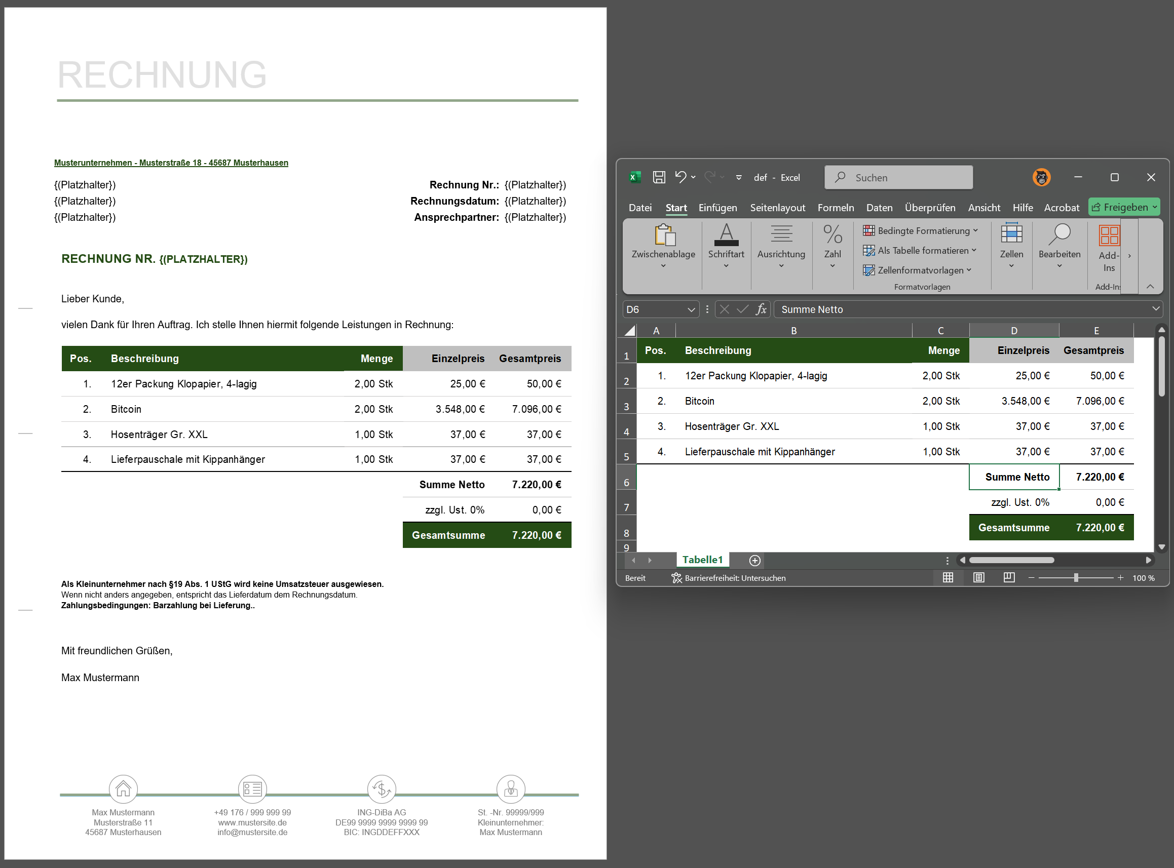 In einem kleinen Fenster öffnet sich dann die Excel Datei, dort kann man Artikelbeschreibung und Preis anpassen, speichern und zack hat es das auch in der Word Datei übernommen.