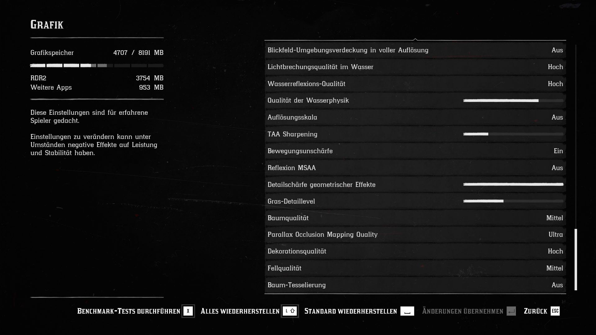 und der rdr2 benchmark isthilfreich. jedoch merke ich hier das eingei einstelleungen die man auf server einstellen sollte nicht übernommen werden.passe ich im sorymode was an heist das cniht automaitsch das es auf dem server pübernommen ist umgekehrt genauso obwohl ich gehört habe das sich das anpasst wenn ich im multilpayer was anpasse übernimmt das spiel im storrymod/singeplayer diese einstelleung. acuh kann ich nur mit 1920x1080 spielen und ahb nur nen 60 hz monitor ne maus die zwar asbachuralt ist und eine neue getestet für 50 euro und ahtte die selben Probleme das wen ich beim reitne die masu nach vorne und hinten bewege leischtes ruckeln drin ahbe was zwar kaum auffält mich aber masivst stört. Ich ahbe diese aktuelle maus schon seit jahren und nie Prpbleme gehabt <uch habe ich merhfach gehört und gelesen man sollte bei nvidia experinace runter werfen hier habe ich festgestellt das viele speile nciht mehr unterstüzt werden.