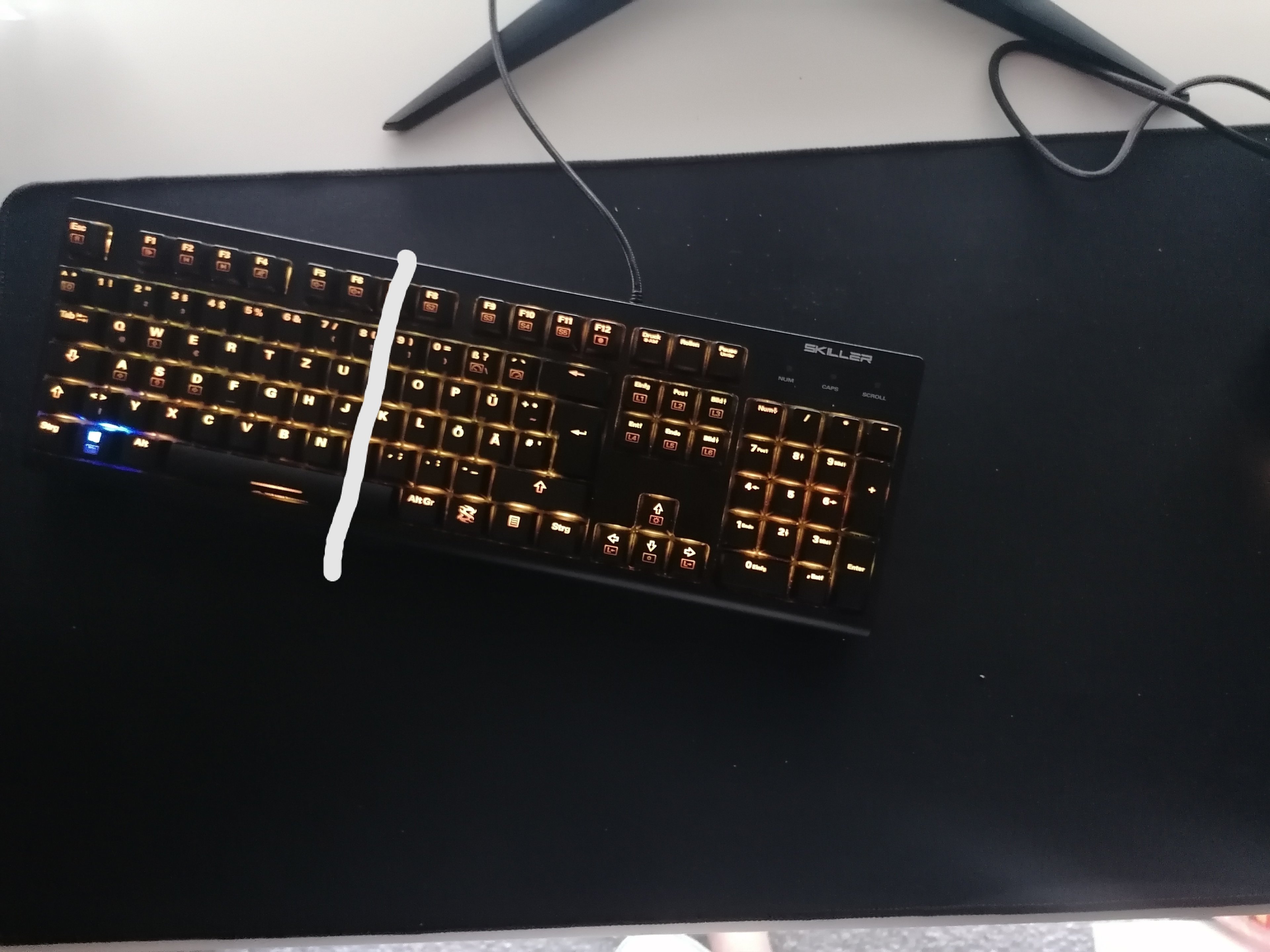 Hallo, ich hab die sgk30 red von sharkoon. Wenn ich die Tastatur nicht komplett gerade stell sondern auf der rechten Seite nach unten wie auf dem Bild zu sehen, lassen sich die Tasten wo auf der rechten Seite sind ein wenig schwerer drücken als die auf der linken mit W, A, S, D, F, G usw. kann es sein dass das was mit dem Winkel zu tun hat? Denn wenn ich die Tastatur nach oben schiebe sind die Tasten der linken Seite schwerer zu drücken dafür die auf der rechten Seite leichter. Also hat das vllt einen Zusammenhang denn sonst glaub ich dass da irgendwas nicht stimmt.