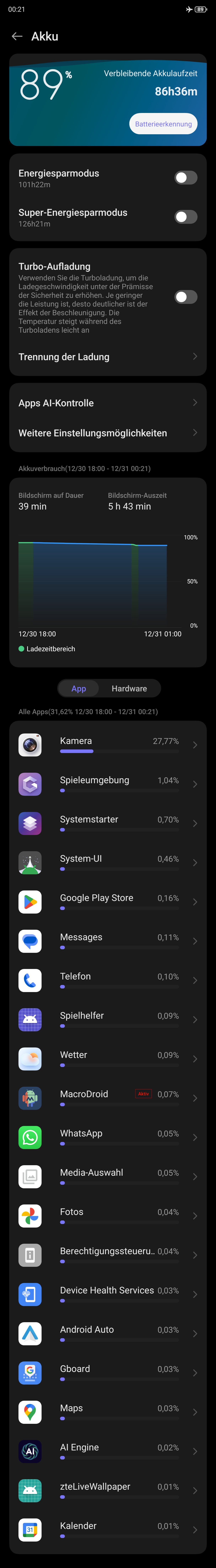 Über Nacht (ca. 7.5-8Std.) im Flugmodus verliere ich 1-2% maximal. Das ist vollkommen in Ordnung. Ich habe euch hier mal einen Screenshot der Akkustatistik gemacht, der aber nicht besonders aussagekräftig sein wird.