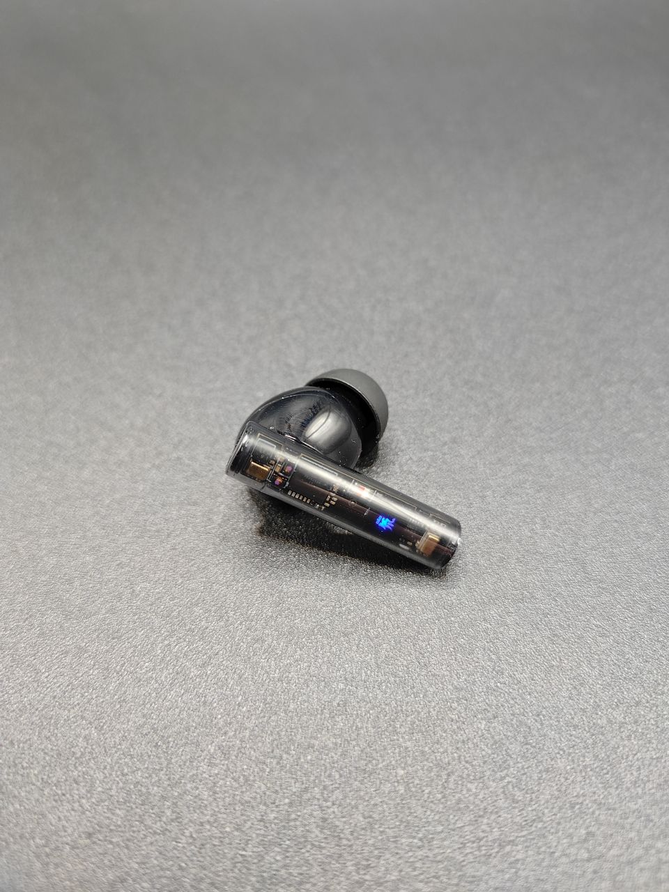 Am Case selber befindet sich ein Knopf mit dem man den Pairing Modus aktiviert und ein USB-C Anschluss zum Aufladen. Die Kopfhörer selber sind auf durchsichtigen Schwarzen Kunststoff gefertigt. Im inneren sieht man diverse Elektronik Komponenten und sobald Sie eingeschaltet sind leuchtet eine RGB LED. Zum entnehmen der Kopfhörer muss man den Deckel vom Case aufschieben.