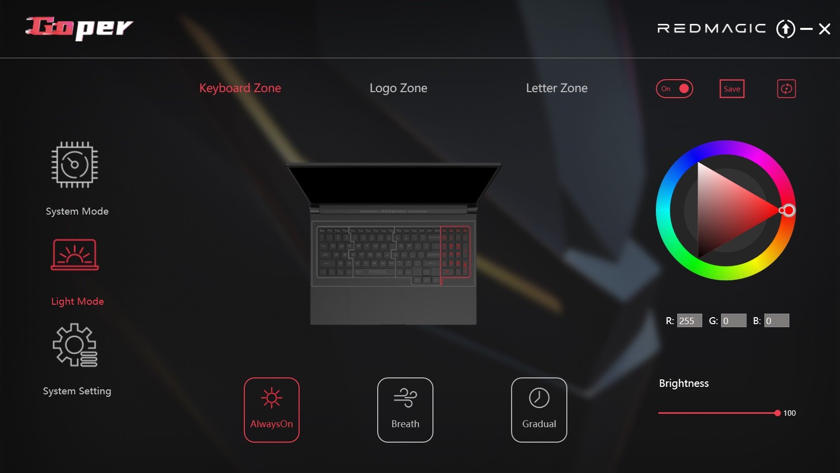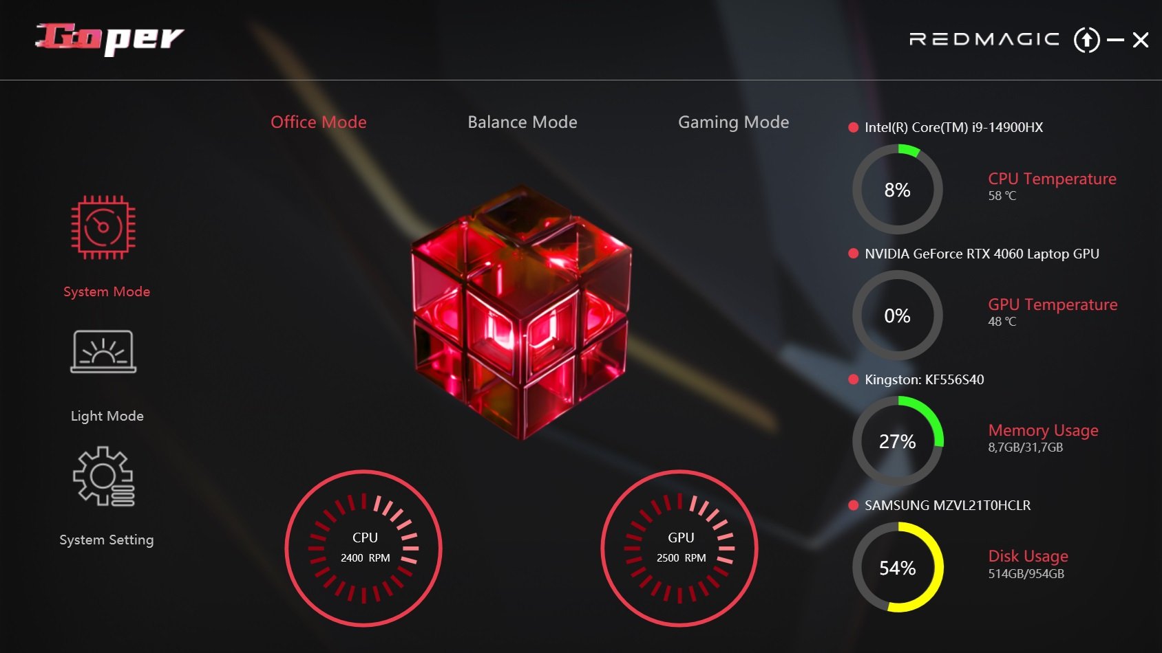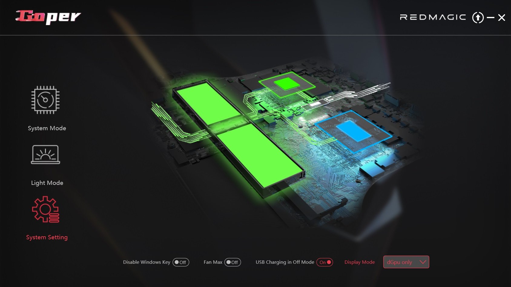 Als Software zum Konfigurieren liefert REDMAGIC ihre eignen GOPER Software mit. Hiermit soll man das Notebook komplett nach seinen Bedürfnissen einstellen können. Im ersten Bildschirm kann man die Leistung in 3 Stufen verstellen (Office, Balance und Gaming), das geht aber auch über dedizierten Tasten auf der Tastatur. Im zweiten Bildschirm kann man die Beleuchtung der Tastatur sowie der beiden Logos einstellen. Die Beleuchtung der Tastatur ist aber obwohl man es gespeichert hat nach einem Neustart verstellt. Man muss also jedes Mal das ganze neu einstellen. Im Dritten Bildschirm (System Settings) kann man die Windows Taste Deaktivieren, Die Lüfter dauerhaft auf maximale Drehzahl stellen, das USB Power Delivery einschalten und den GPU-Mode ändern (dedizierte GPU, automatisches umschalten von iGPU zu dedizierter GPU (iGPU Only).