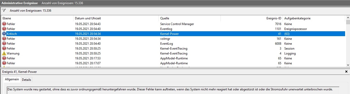 Gelegentlich habe ich anschließend das Ereignisprotokoll aufgerufen. Die Einträge sind nicht eindeutig und wiederholen sich meist nicht. Am häufigsten taucht die ID 41 Kernel-Power auf, aber nicht jedes Mal.