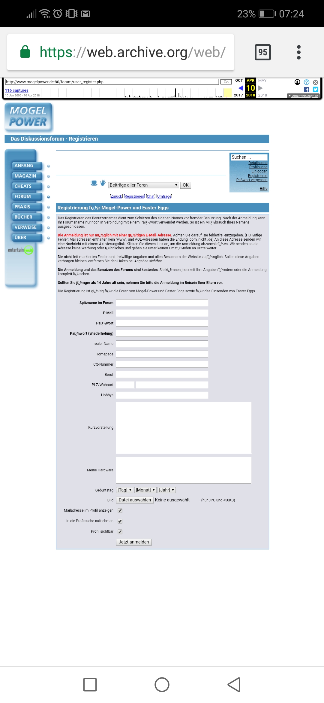 Ich wollte mich gestern auf der Webseite Mogelpower im Forum registrieren, doch aus irgendeinem Grund ist dort das Anmeldefeld verschwunden (wo man draufklicken musste, um die Registrierung abzuschließen). Hab auch schon auf anderen Browsern probiert mich anzumelden, aber auch da kein Anmeldefeld.