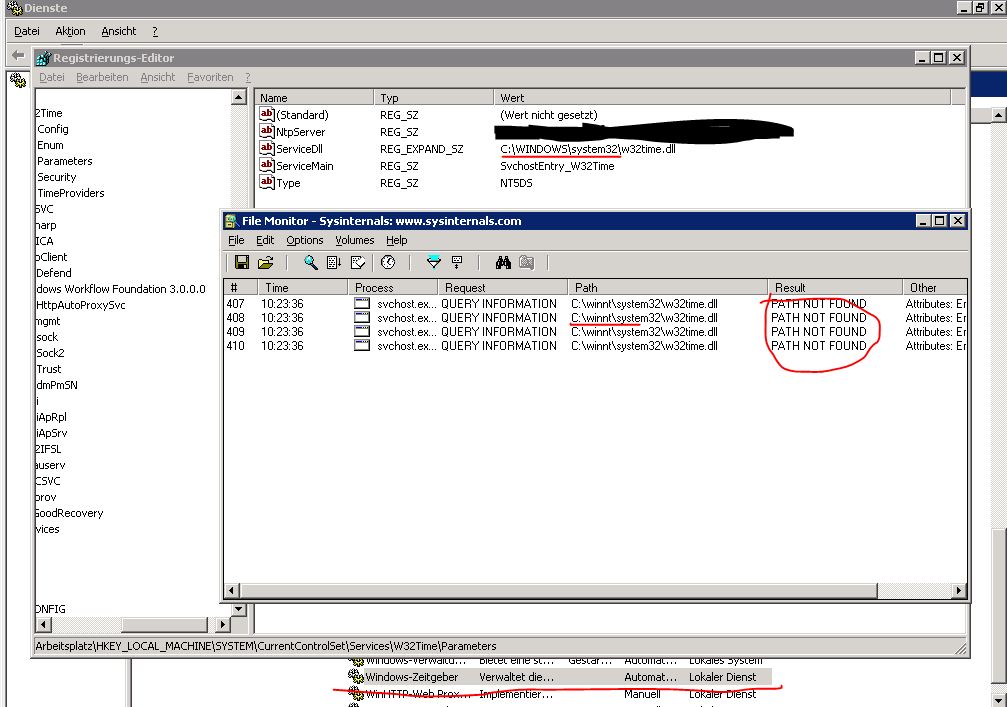 Habe das mit Filemon geprüft (Filter auf w32time.dll und zeitgeberdienst versucht zu starten) und das kam daber raus: PATH NOT FOUND. Also wie vermutet.