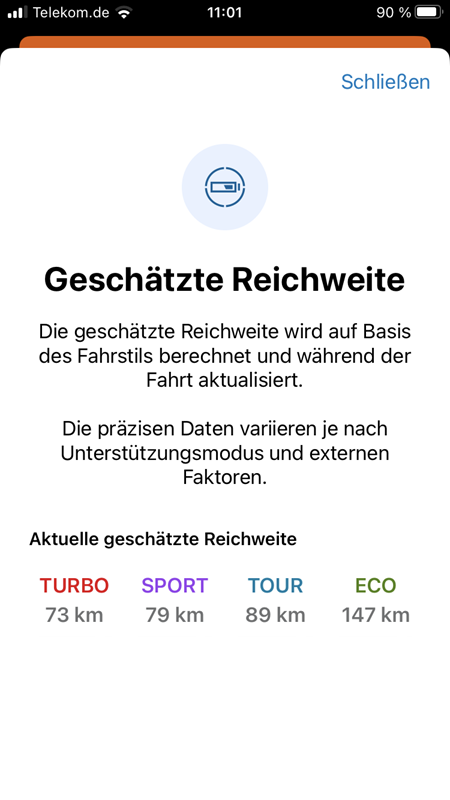 Bisher bin ich 75 km gefahren (ca. 100 Höhenmeter, 70 bis 80 Umdrehungen/Trittfrequenz, ca. 23 km/h Durchschnitt, mein Gewicht 93kg) Ich nutzte ca. 50% Eco Modus, 5% Tour und 45% Off Modus) Verbraucht habe ich bei diesen Parametern 41% Akkuleistung (Licht aus)