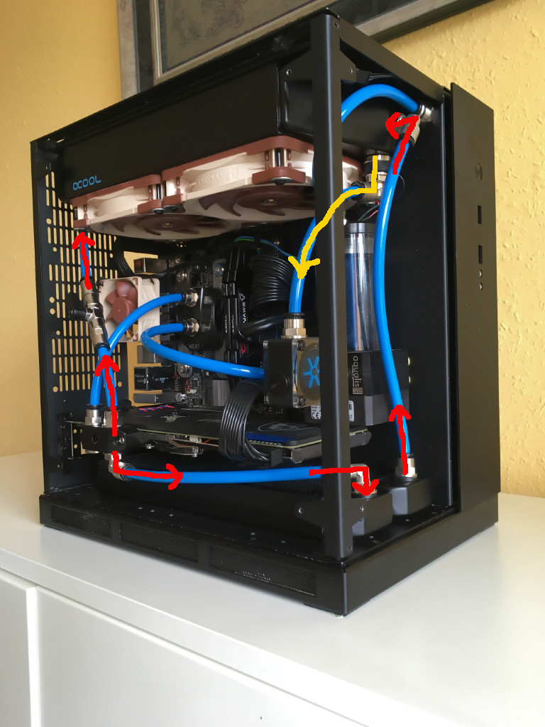 - Der Gesamtdurchflusswiderstand ist sicherlich geringer, doch wirkt sich das nicht auf die Wassertemperatur aus. Möglicherweise ein bisschen auf die CPU-Temperatur (mehr Durchfluss im Kühler), aber auf die habe ich gar nicht geachtet, da ich nur auf die Wassertemperatur gestarrt habe, ich Depp…