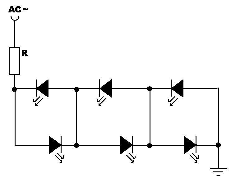 LEDs gehören mit Gleichspannung betrieben. Alles andere ist einfach Pfusch. 12-24Vdc und entsprechend der LED-Type mit dem R den Strom einstellen (10-30mA). Für jeden der Parallelkreise.