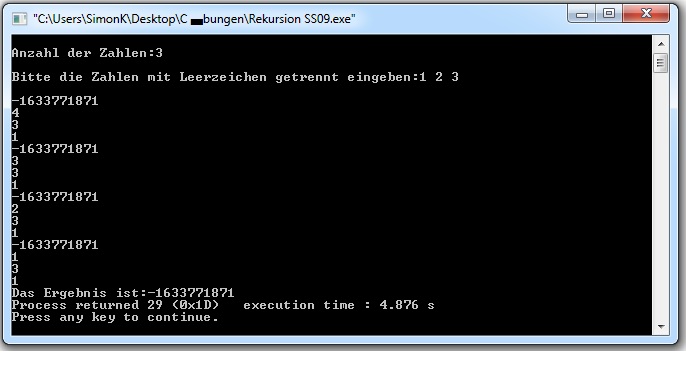printf("\nDas Ergebnis ist:%d", subadd(zahlen, n, ergebnis, i));
