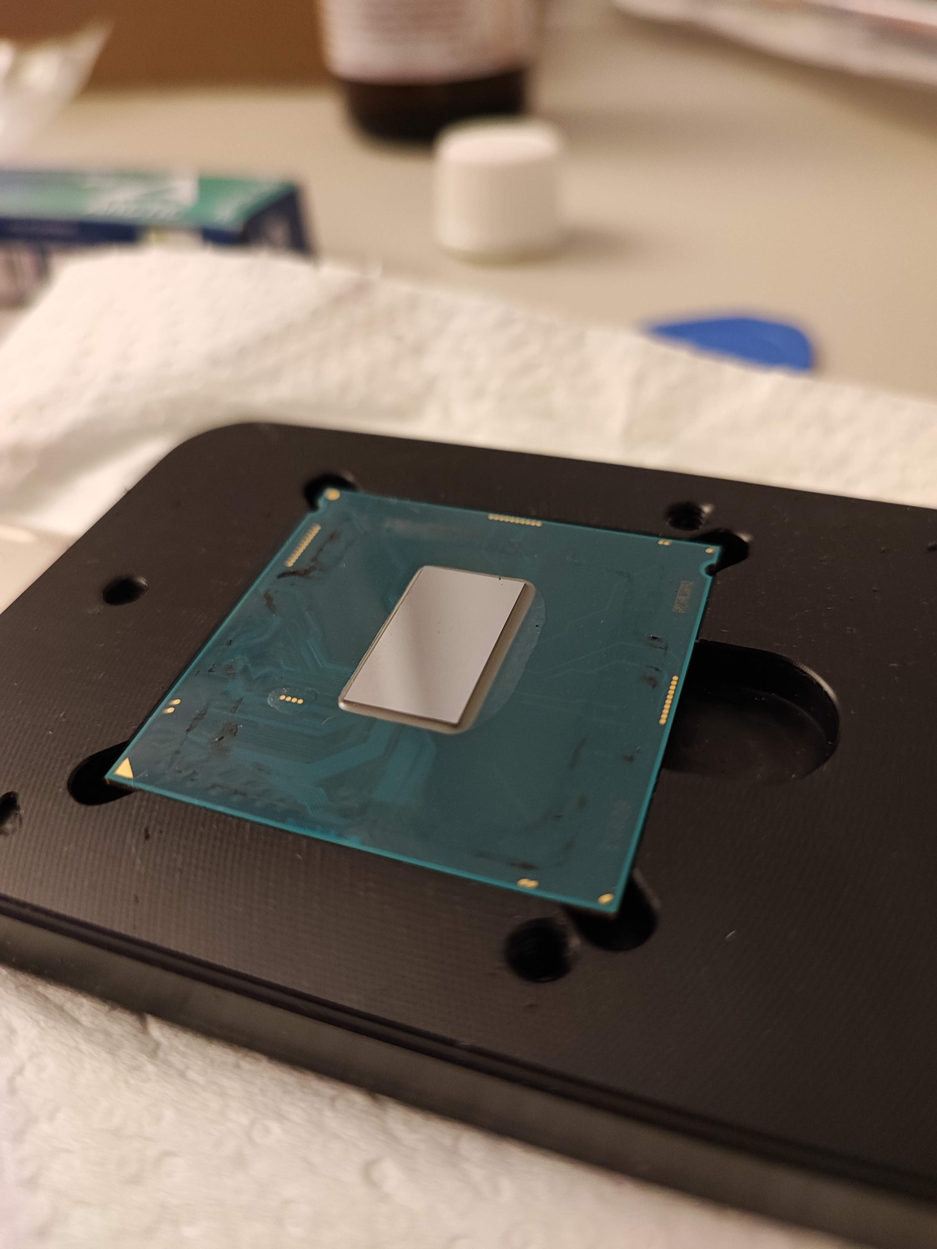 Ich habe an der CPU so heftig gekratzt, mir ist sie aus dem Delid Tool paar mal rausgefallen. Ich hatte Angst, dass die CPU am Ende ist, habe einfach MX-4 auf die DIE geklatscht und CPU wieder rein ohne zu verkleben. IHS hält ja auch so. (Conductonaut kommt morgen erst)