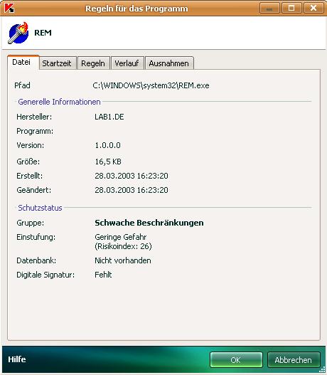 Habe gerade die Programmkontrollliste bei Kaspersky durchgesehen und dabei ist mir eine Datei namens REM.exe aufegefallen (C:\Windows\system32\REM.exe. Weiss jemand was das ist ?