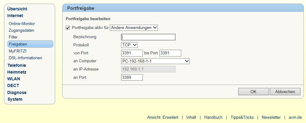 Port 3389 kann ich ja mit der Fritzbox automatisch freigeben.