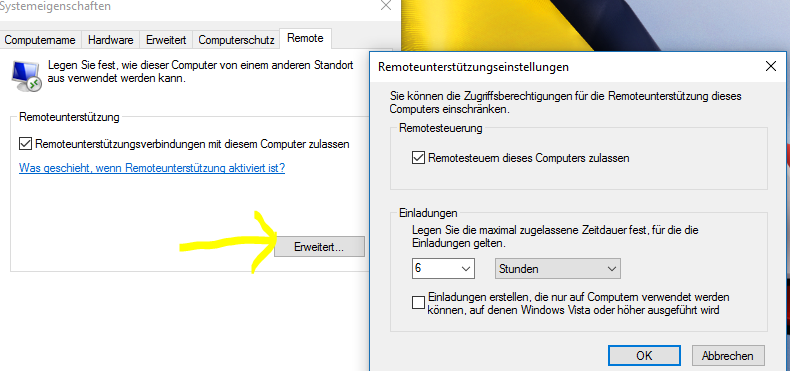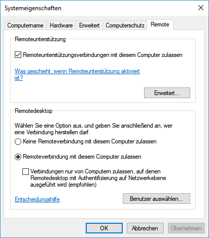 Ich habe auf beiden das Häkchen bei "Remoteunterstützungsverbindungen auf diesem Computer zulassen" gesetzt. Wie soll ich den jetzt einen Benutzer hinzufügen, wenn kein "Remotedesktop" vorhanden ist? Muss ich überhaupt einen hinzufügen?