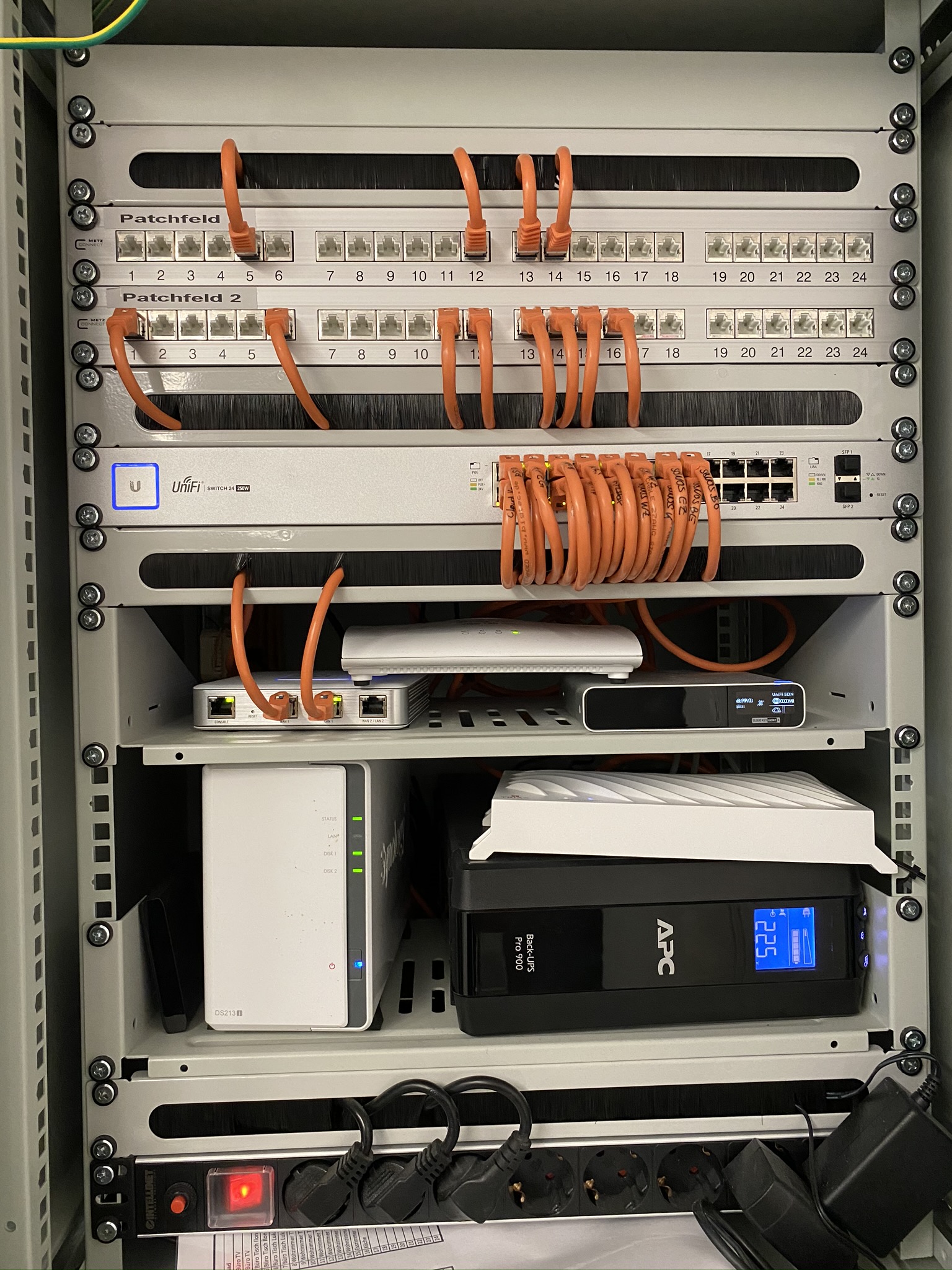 Im Keller, wo der Hauptrouter (FritzBox 7490) steht, kommen letztlich alle Cat7-Kabel an. Die bisherigen 2 Cat7-Kabel enden in Aufputz-Netzwerkdosen und diese sind mittels Rj45-Kabel dann mit der FB verbunden. Zusätzlich hängt noch eine ISDN T-Concept XI 521 Anlage aus 1995 via S0-Bus an der FritzBox.