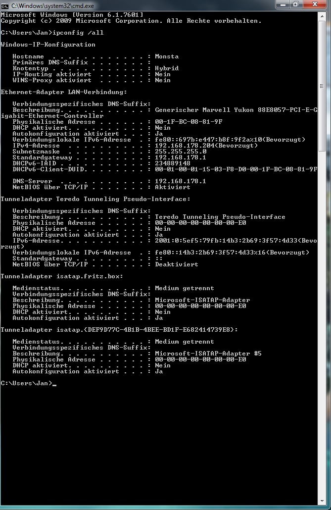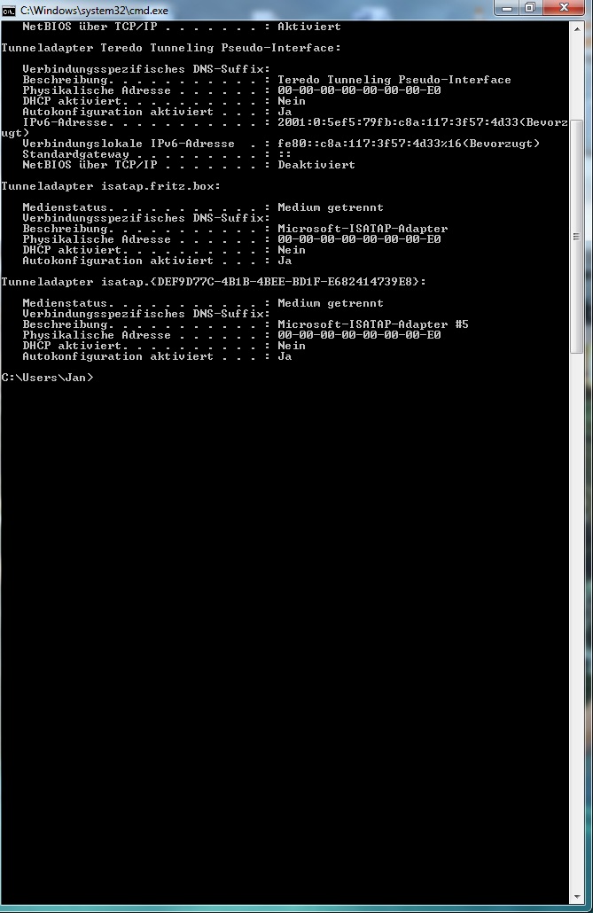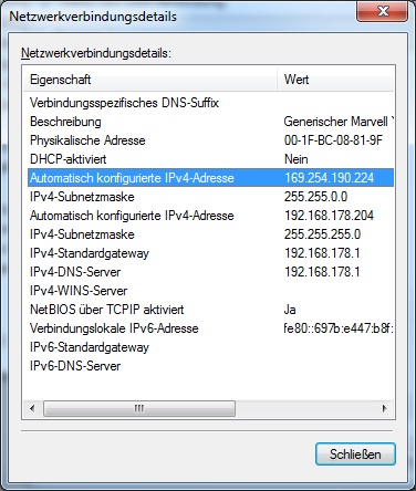 Du hast hier komischerweise zwei mal "Automatisch konfigurierte IPv4 Adresse" stehen - mach mal einen Neustart und kopier danach die Ausgabe von "ipconfig /all" in der Eingabeaufforderung, dort sollte wirklich nur eine IP erscheinen.