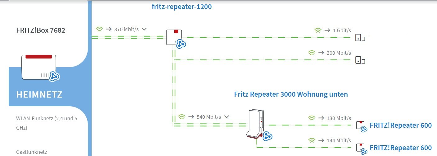 Du musst den Repeater 3000 und die 7682 näher zusammen bringen oder einen weiteren Repeater auf der Strecke einsetzen. Kabel ist immer besser aber das wird sicher nicht so einfach.