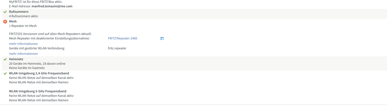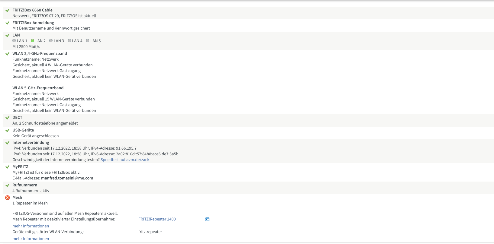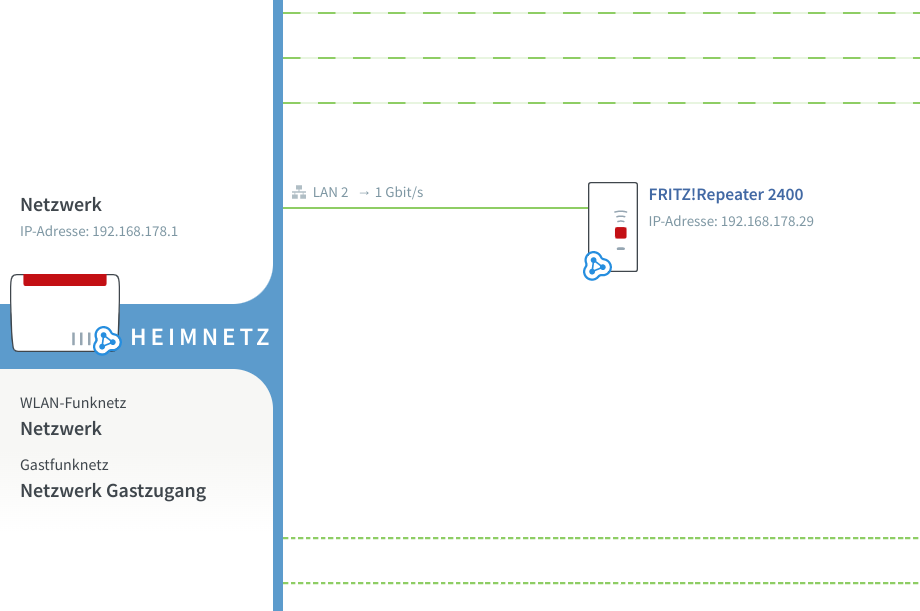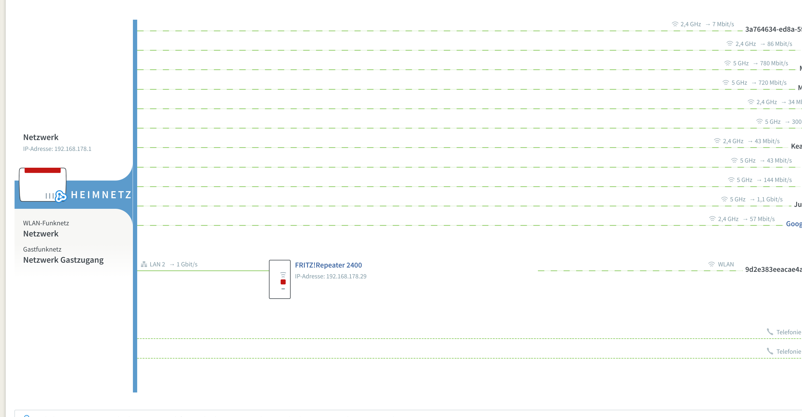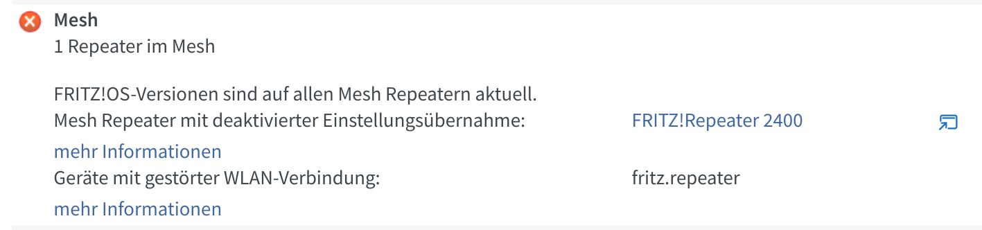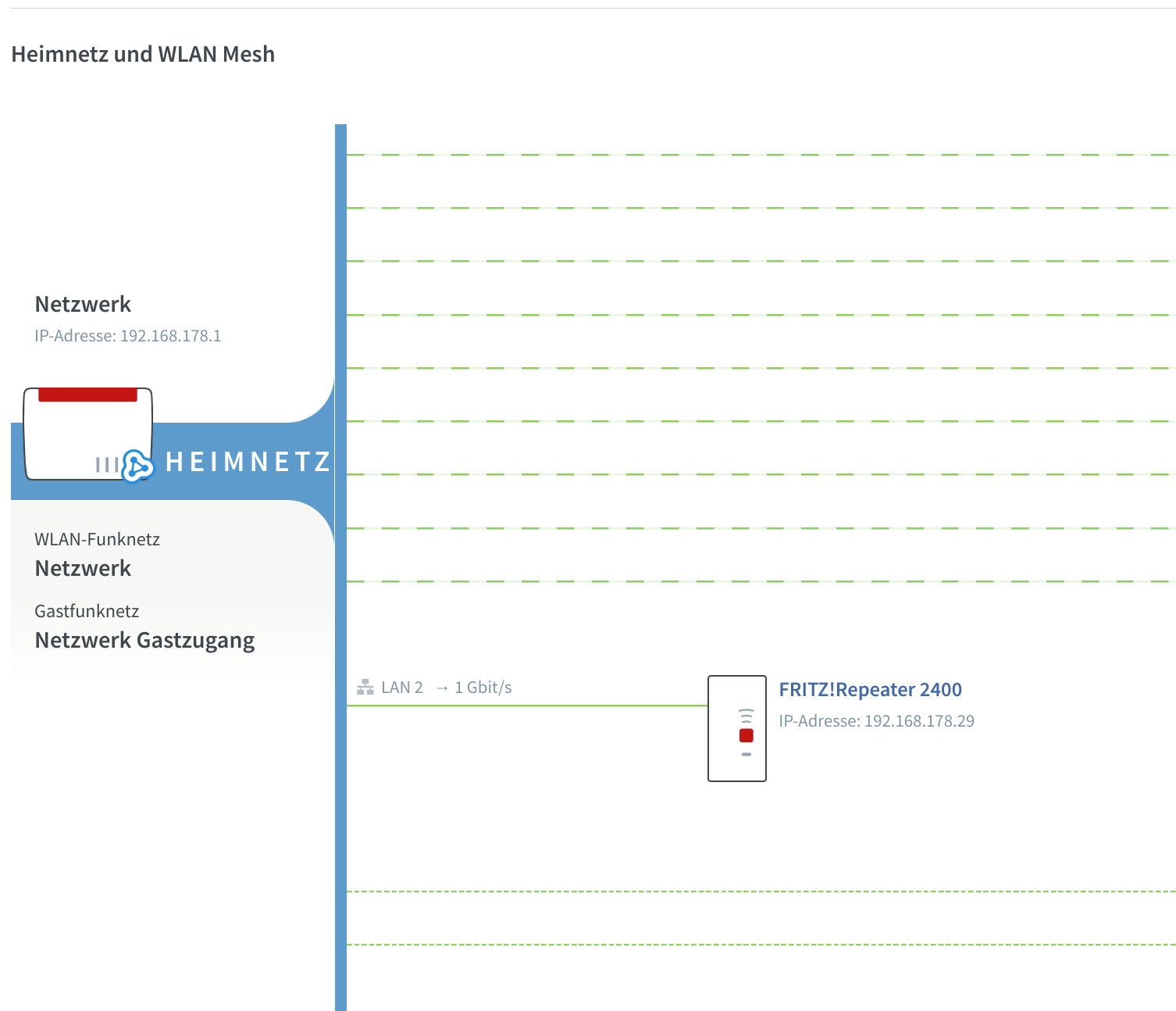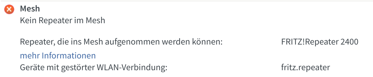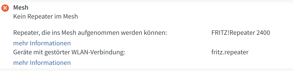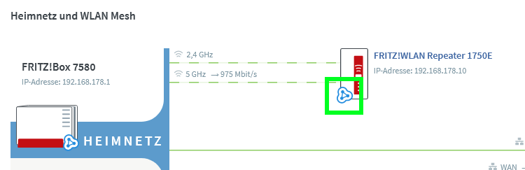 Im Erdgeschoss gibt es eine Fritz 6660. im 2OG haben wir einen Fritz Repeater 2400. Dieser ist als Access Point (Fritz nennt das LAN Brücke) eingebunden ins Mesh.