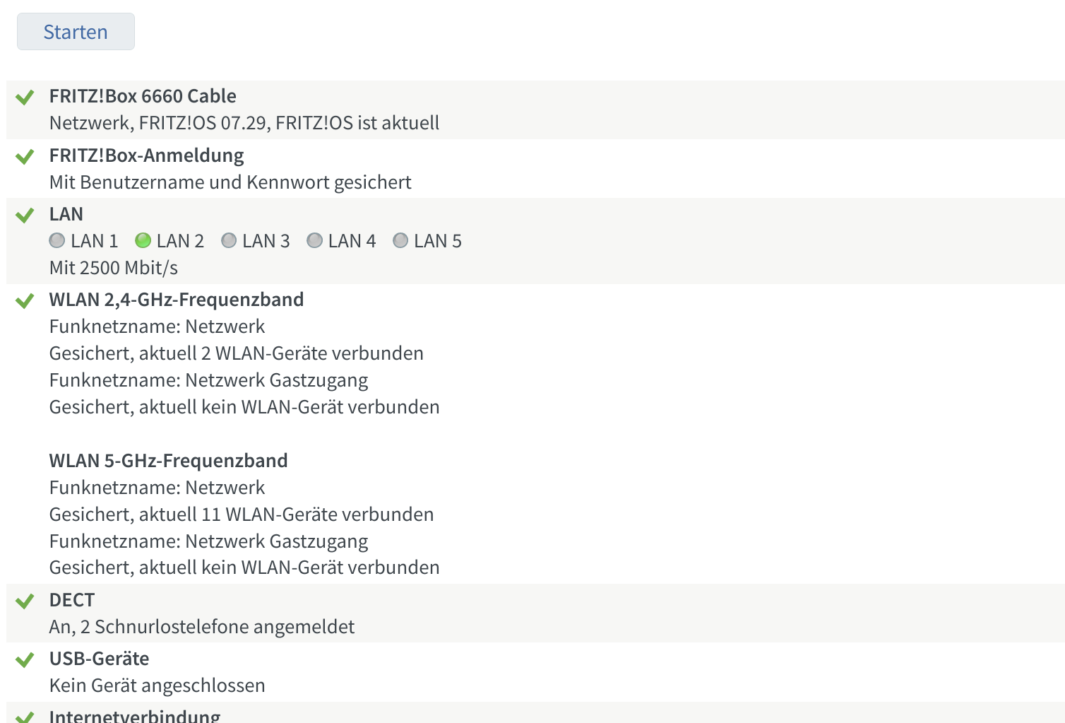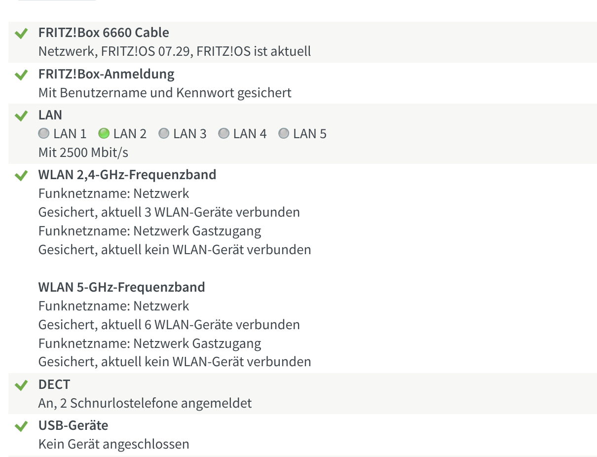 Zwei Ausschnitte der Diagnose der 6660 Fritzbox habe ich angehängt. Ich habe, soweit ich mit erinnern kann, nichts geändert. Zumindest nicht bewusst (will die Schuld nicht von mir weisen, aber ich würde behaupten, ich habe nichts gemacht). An den Settings hat auf jeden Fall keiner herumgespielt.