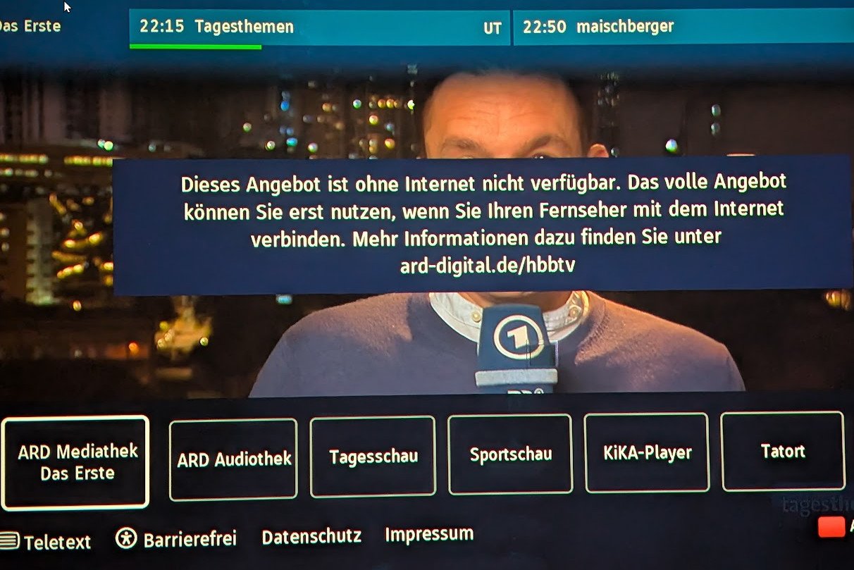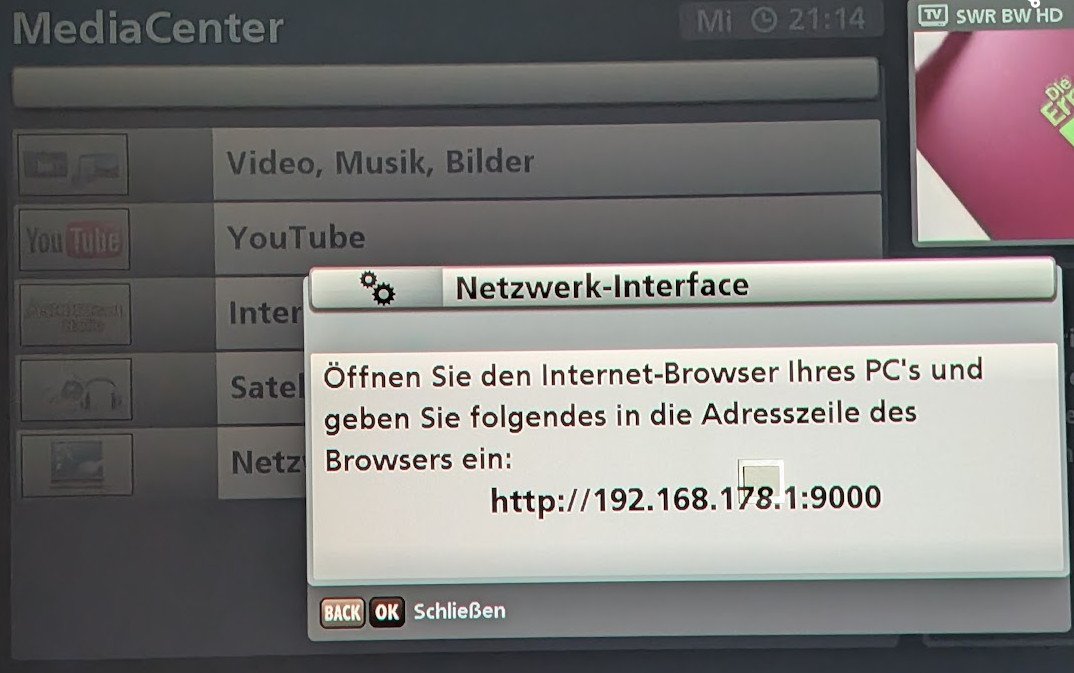 Richtiges Internet hatte ich trotzdem nicht am Receiver. Ich konnte zwar erstmals die Startleiste der ARD-Mediathek über das erste Programm drüberblenden, das ging sonst nicht. Aber von der Startleiste aus einen neuen Film aufrufen, das ging nicht - es hieß, ich hätte kein Internet. Allmählich glaube ich das selbst. Auch die Verbindung zum Netzwerk-Interface wie angezeigt funktionierte nicht (s.Fotos).