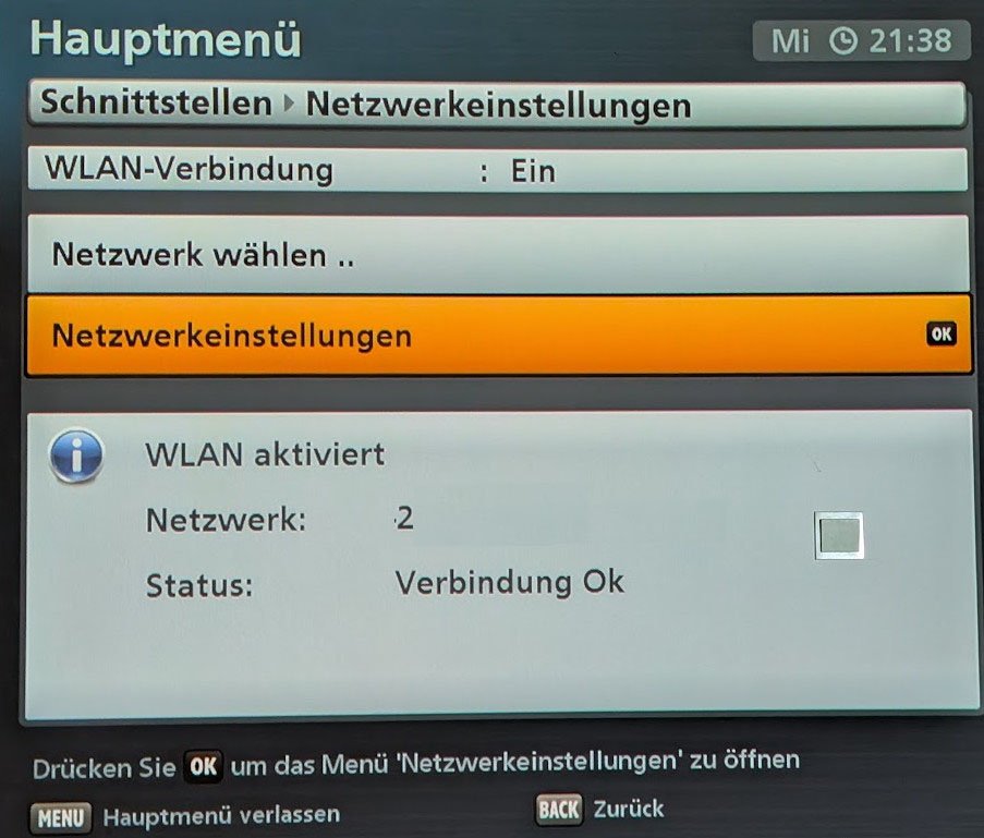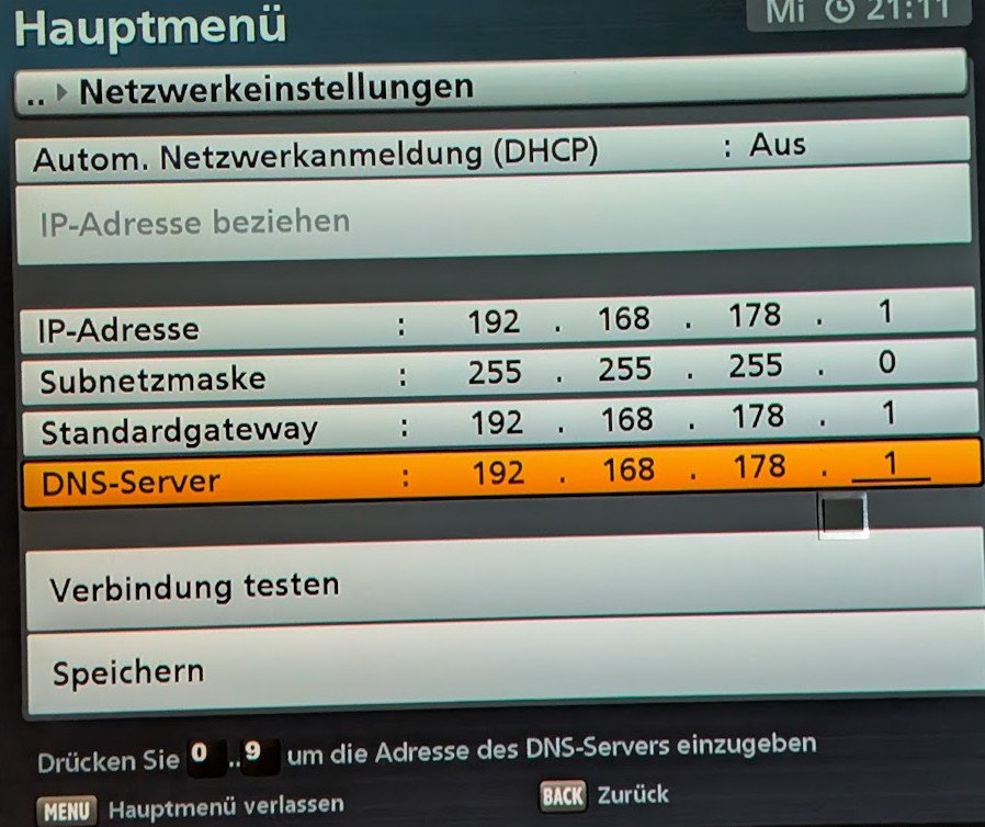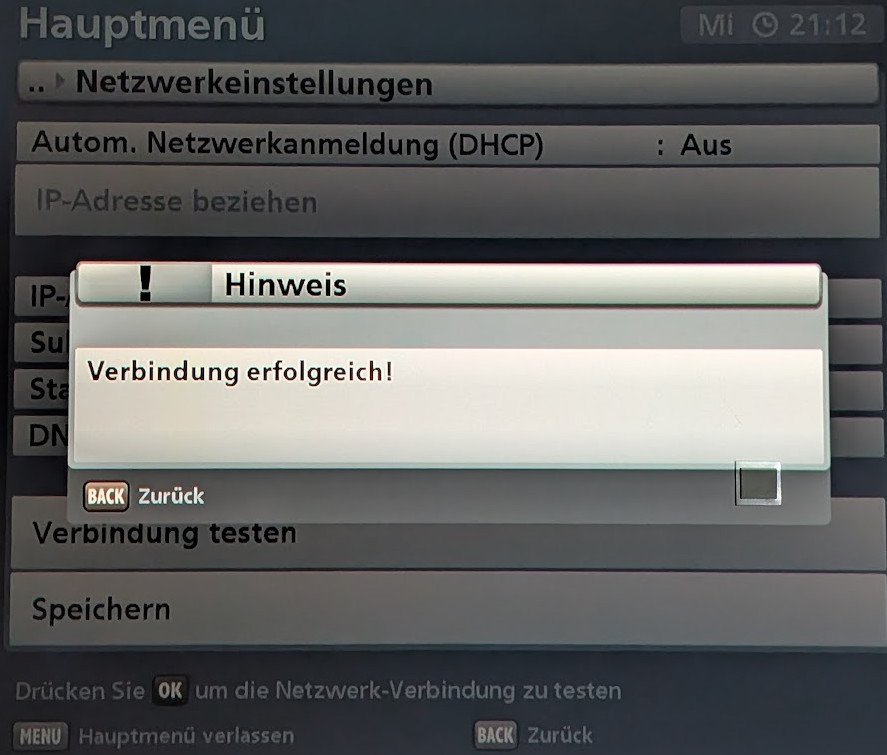 Die erforderlichen Daten für Subnetzmaske und DNS-Server hatte ich zwischenzeitlich in den WLAN-Einstellungen vom Handy gefunden und dann manuell am Kathrein-Receiver eingetragen. Danach hieß es doch tatsächlich erstmals am Receiver “Verbindung erfolgreich“.